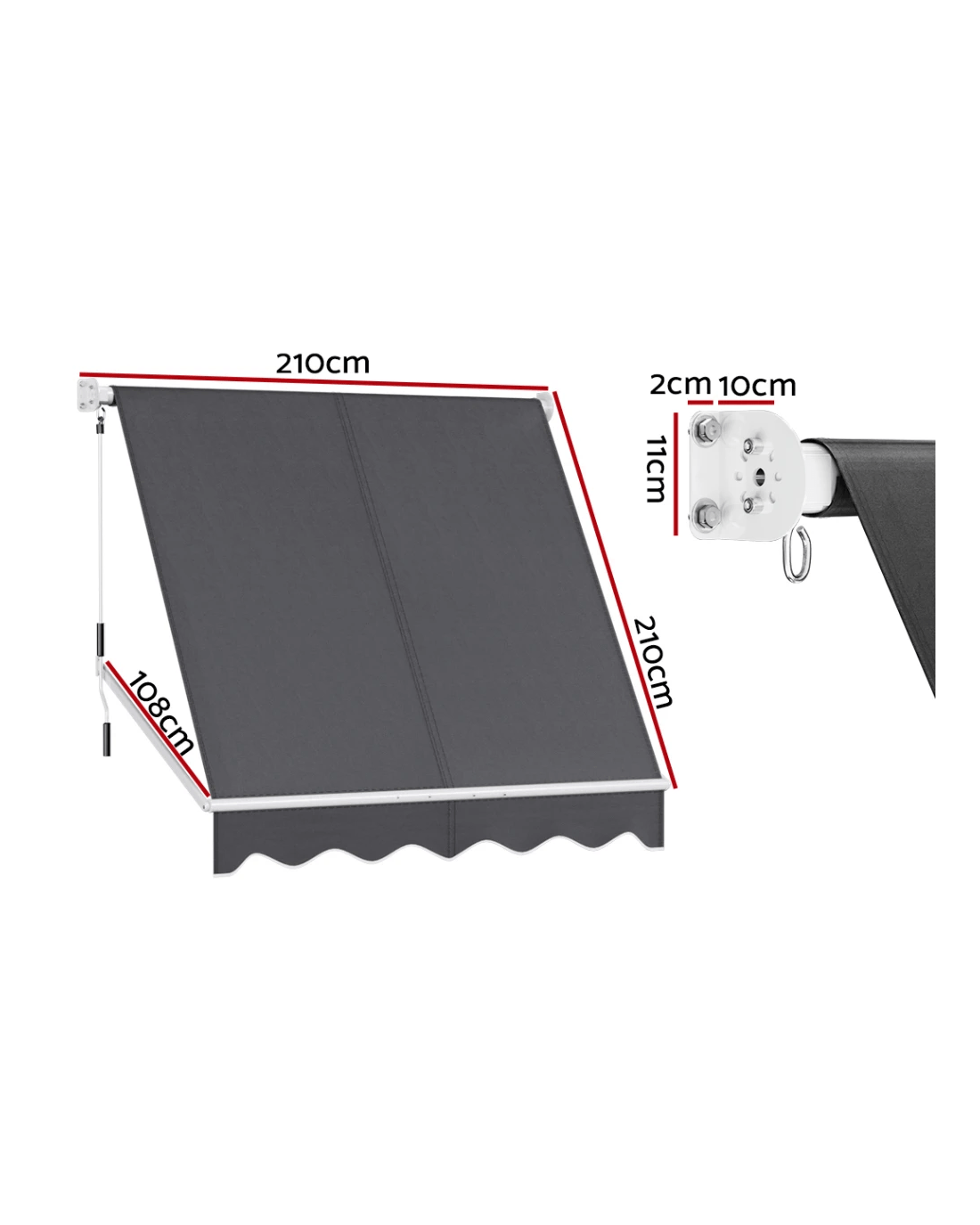 Measuring 2.1m x 2.1m, our Retractable Pivot Arm Awning comprises a sturdy steel frame and high-quality and highly breathable 100% polyester fabric shade. That's means you get good air flow for maximum ventilation and ample cool shading as well. Both frame and shade are made UV and tear-resistant respectively and designed to be durable and longlasting in all kinds of weather conditions(Only for normal weather condition,extrem weather condition is excluded).