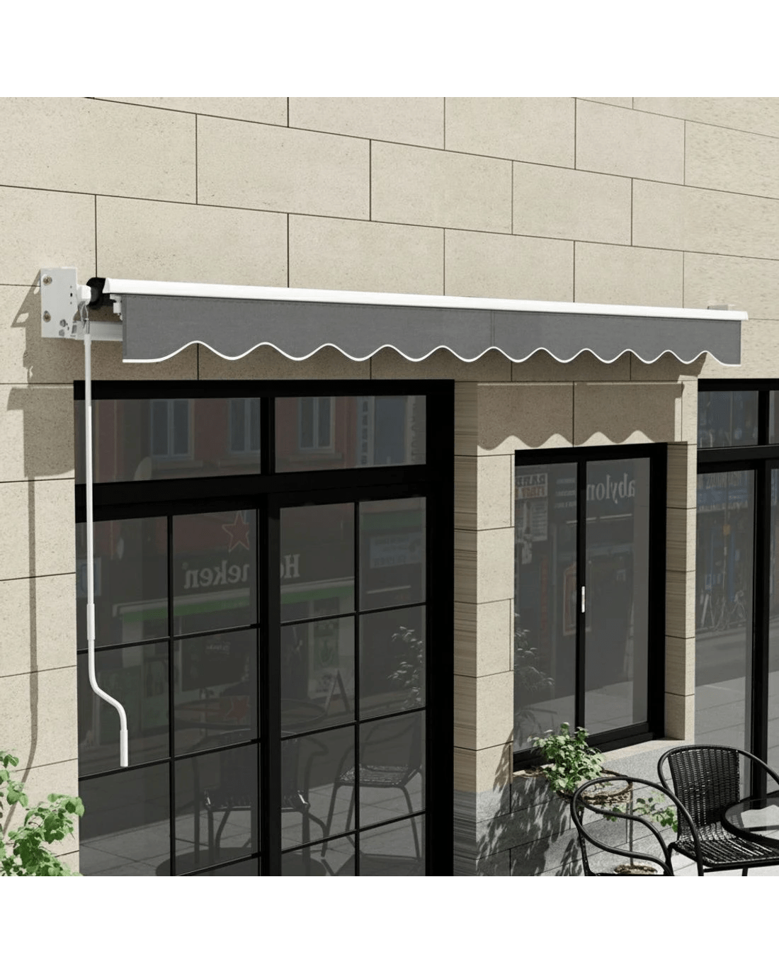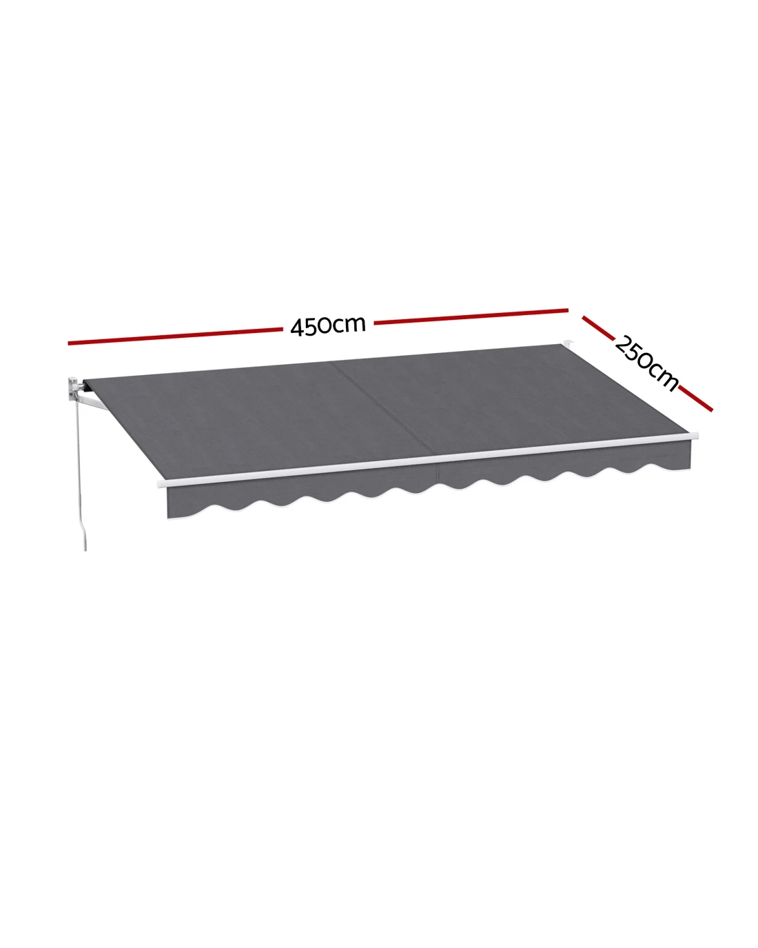 Measuring 4.5m x 2.5m, our folding arm awning comprises a powder-coated aluminium frame and a high-quality 300gsm polyester fabric shade. Both frame and shade are made UV-resistant and designed to be durable and longlasting in all kinds of weather conditions(Only for normal weather condition,extrem weather condition is excluded).