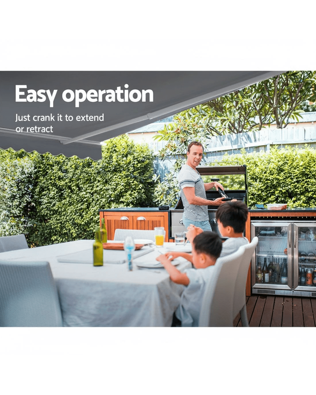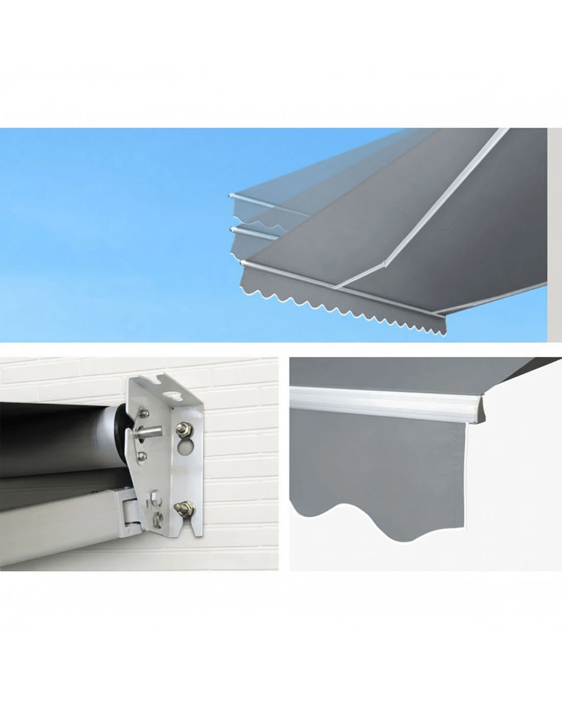 Measuring 4m x 3m, our folding arm awning comprises a powder-coated aluminium frame and a high-quality 300gsm polyester fabric shade. Both frame and shade are made UV-resistant and designed to be durable and longlasting in all kinds of weather conditions(Only for normal weather condition,extrem weather condition is excluded).