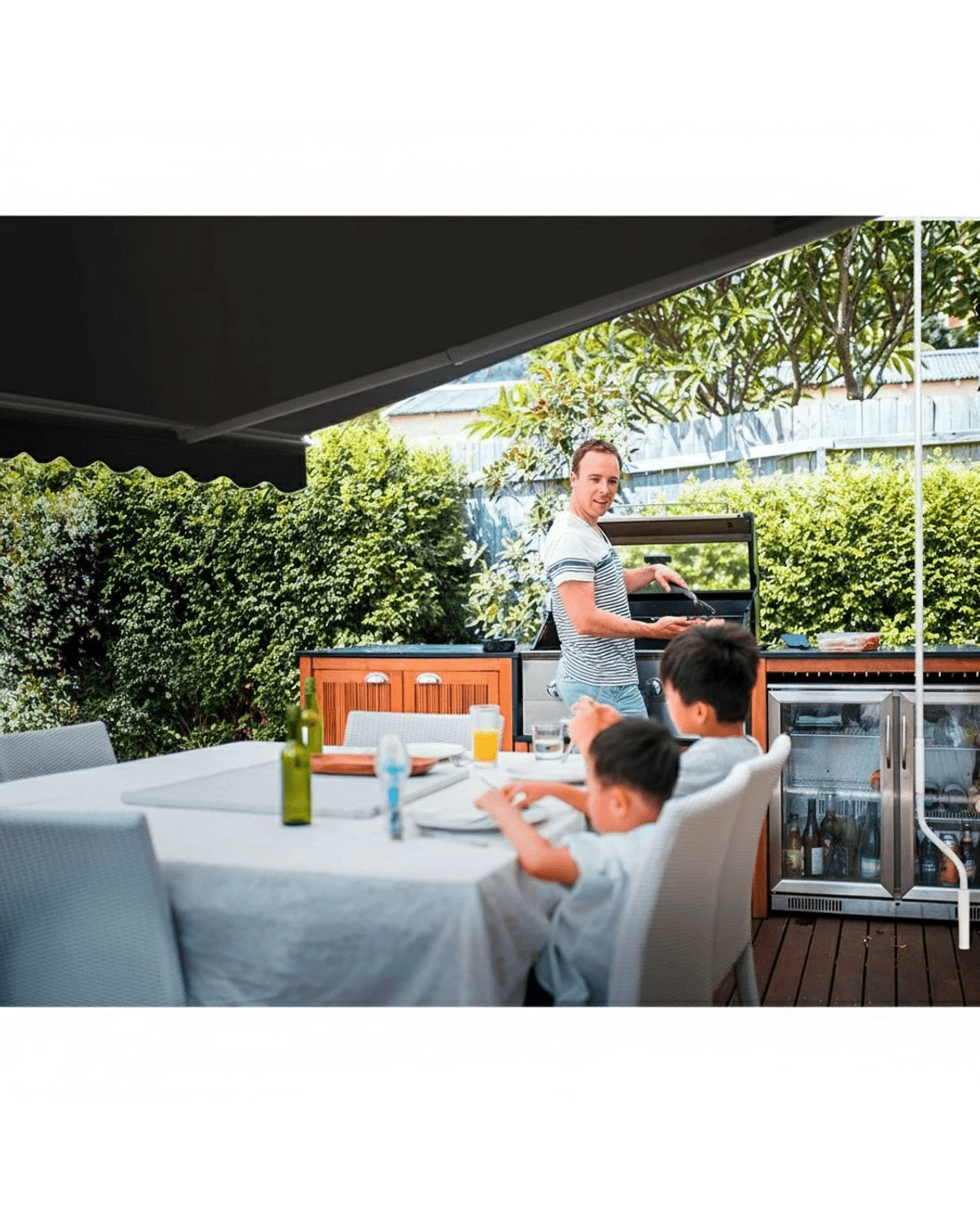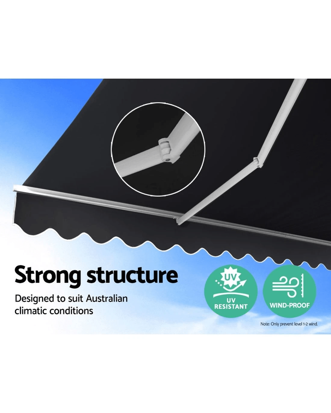 Measuring 5m x 3m, our folding arm awning comprises a powder-coated aluminium frame and a high-quality 300gsm polyester fabric shade. Both frame and shade are made UV-resistant and designed to be durable and longlasting in all kinds of weather conditions(Only for normal weather condition,extrem weather condition is excluded).
