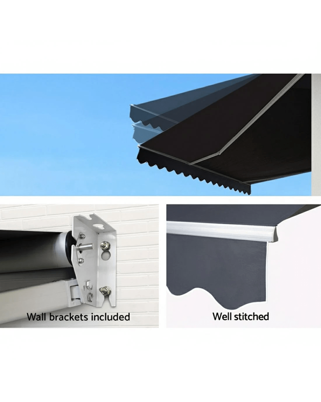 Note: The fixings supplied are for brick walls and concrete walls only. For other structural fixing, please contact your local qualified buiilder or hardware store for recommended fixings. For safety reason, we strongly recommend using a qualified builder to install your awning.