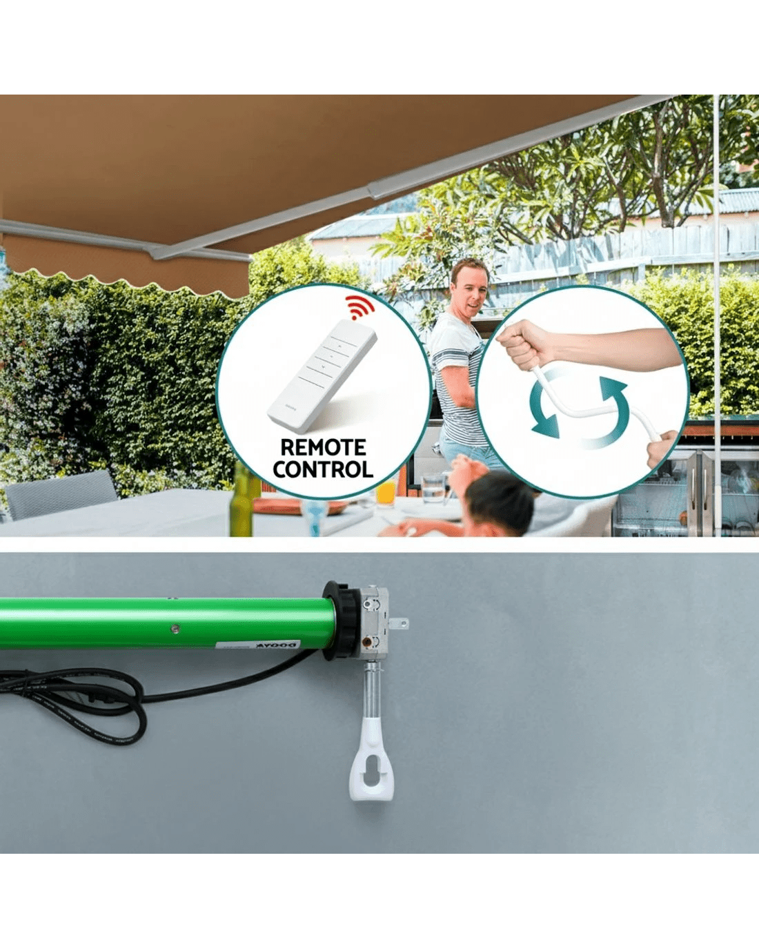 Come with a hand crank and an awning motor