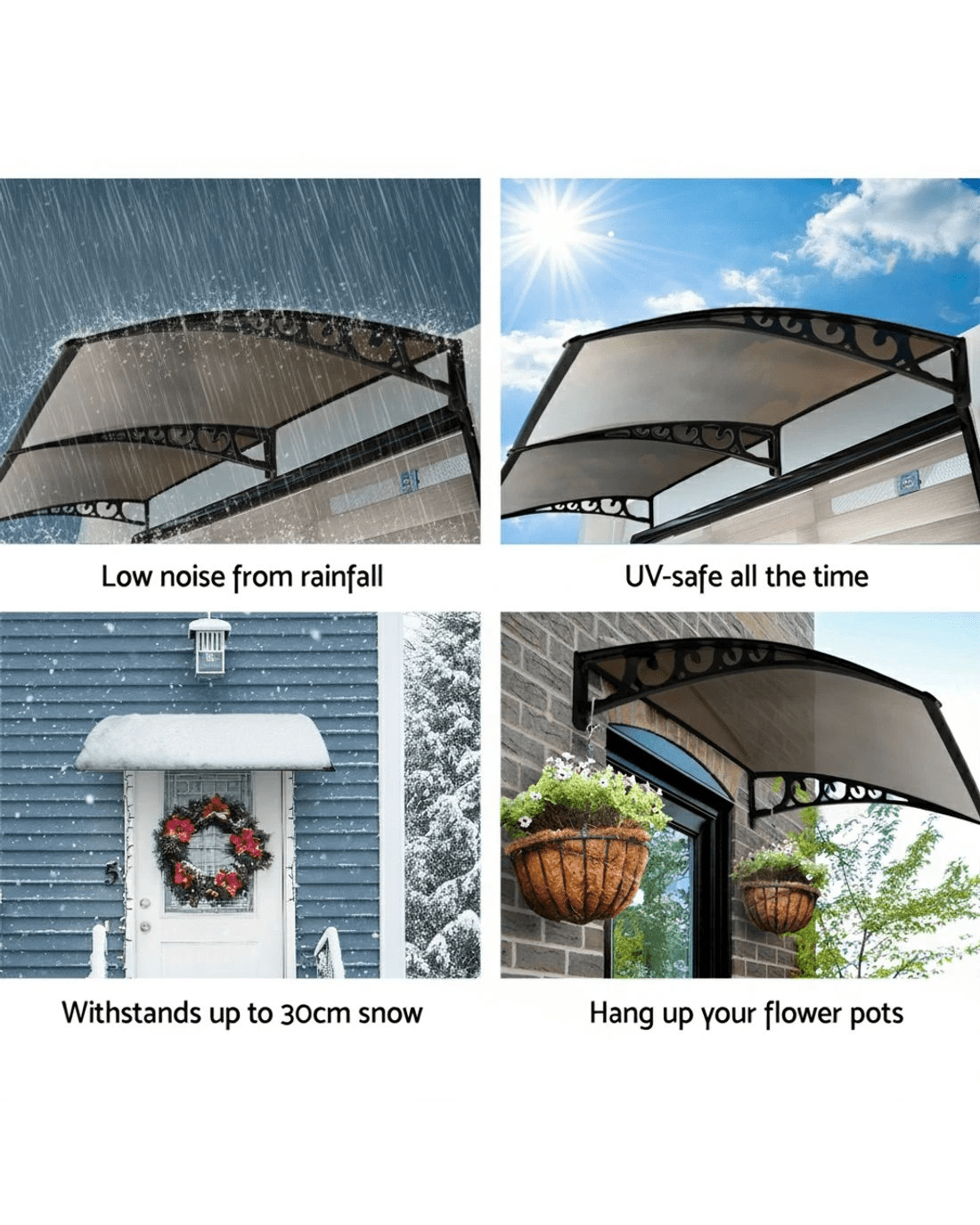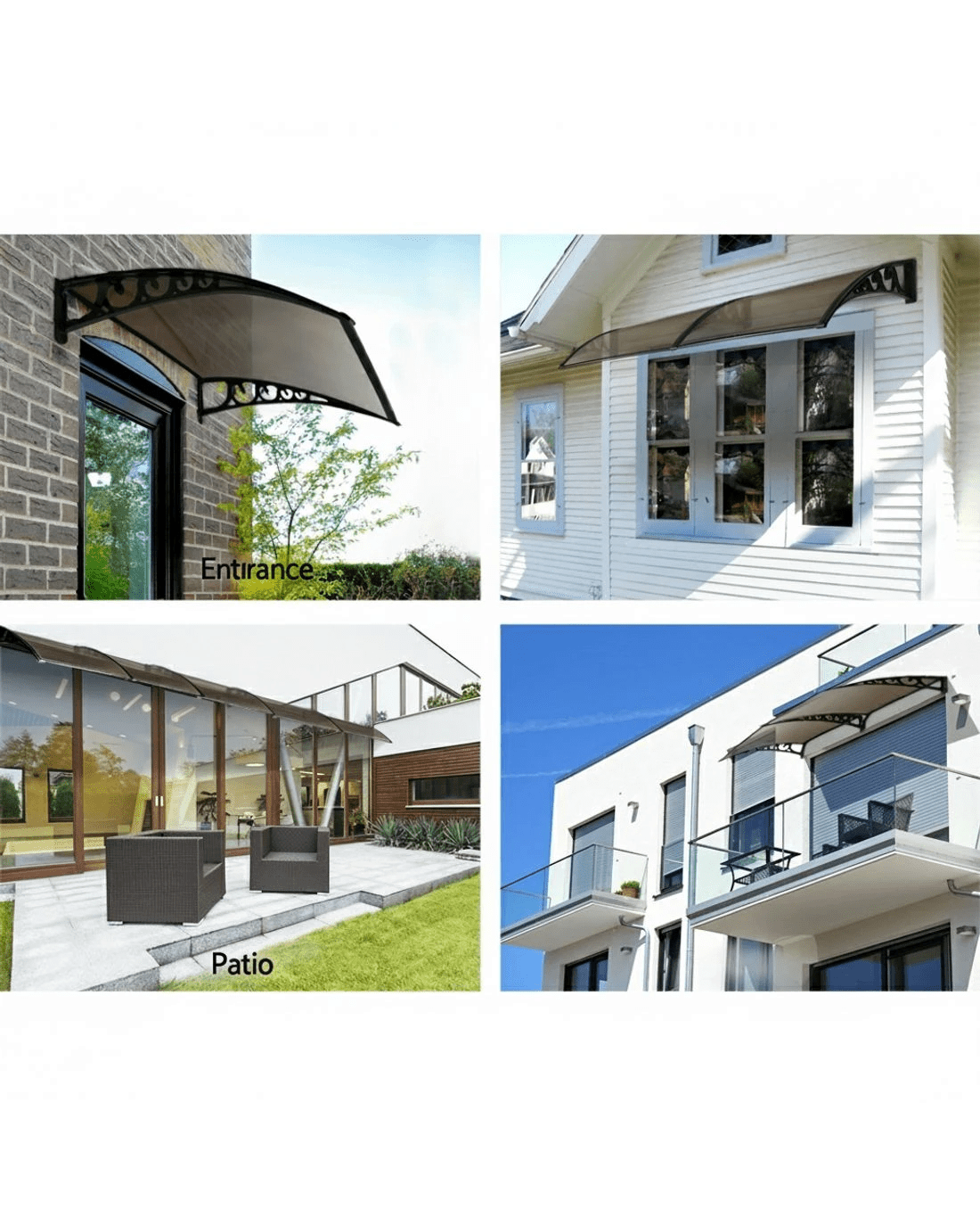 Time to spruce up that tired-looking door or window? Looking for some 'shady' ideas to keep the sun and rain a few steps away? And possibly add value to your home? How about a spot of DIY with our awesome looking window or door awnings. Featuring a durable 5mm thick hollow panel, the Door and Window awning is ideal for home or office use and is designed to double up as a door canopy or balcony cover if required. The panel is affixed to sturdy aluminium bars and the entire assembly is corrosion-resistant. Which simply means many good years of all-weather protection(Only for normal weather condition,extrem weather condition is excluded) for your doors and windows. And of course, looking absolutely stylish and modern with your home or office building too.