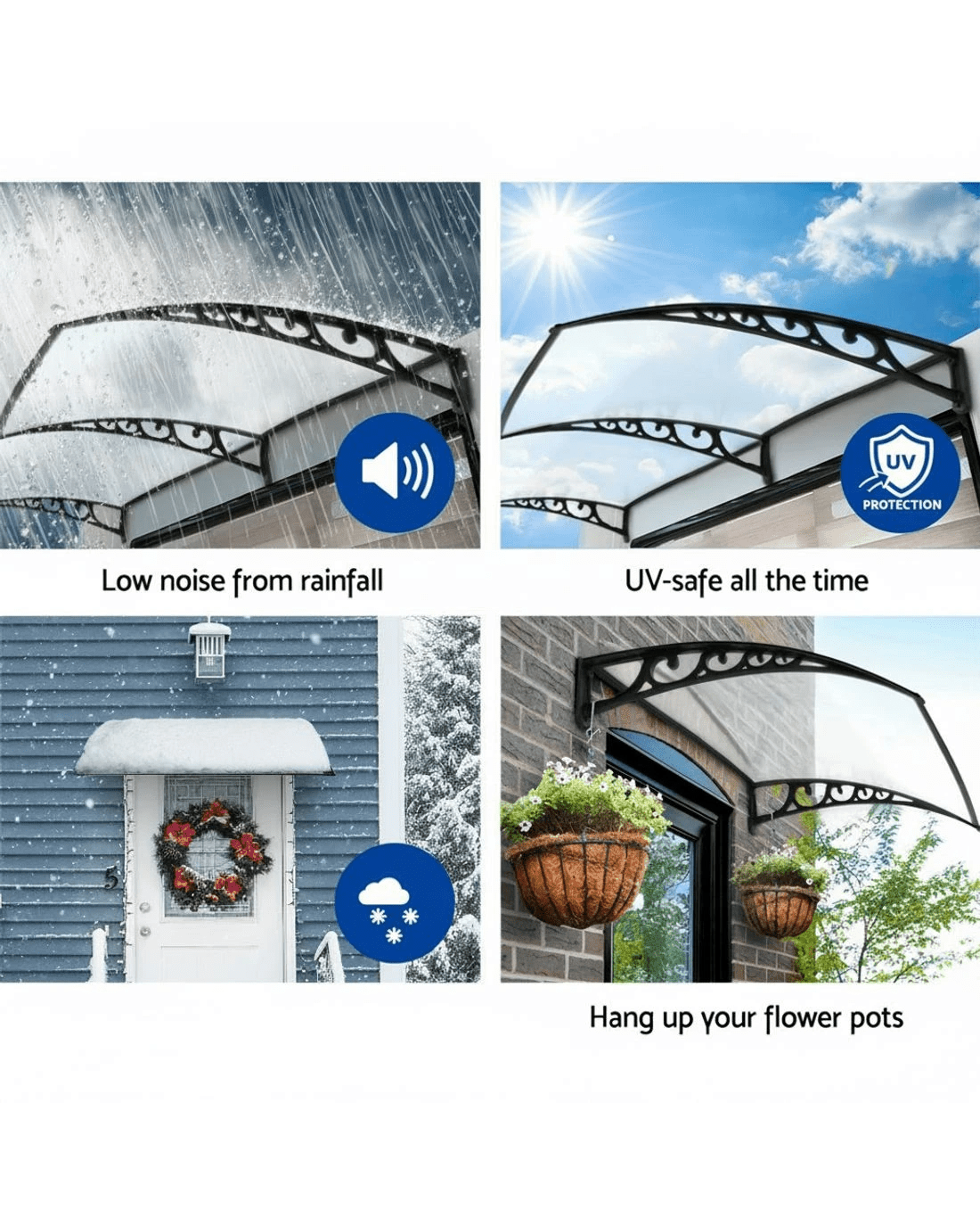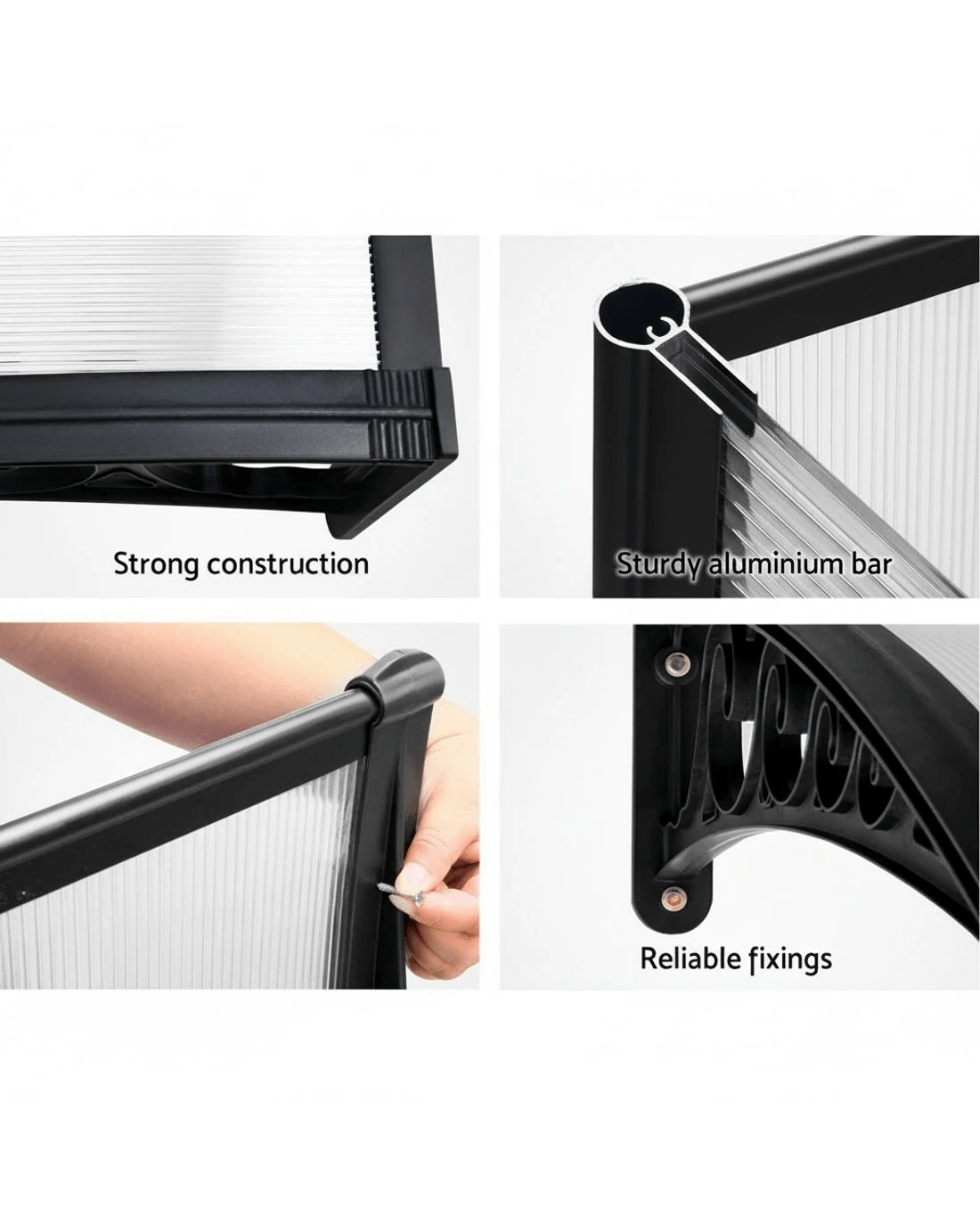 Time to spruce up that tired-looking door or window? Looking for some 'shady' ideas to keep the sun and rain a few steps away? And possibly add value to your home? How about a spot of DIY with our awesome looking window or door awnings. Featuring a durable 5mm thick hollow panel, the Door and Window awning is ideal for home or office use and is designed to double up as a door canopy or balcony cover if required. The panel is affixed to sturdy aluminium bars and the entire assembly is corrosion-resistant. Which simply means many good years of all-weather protection(Only for normal weather condition,extrem weather condition is excluded) for your doors and windows. And of course, looking absolutely stylish and modern with your home or office building too.