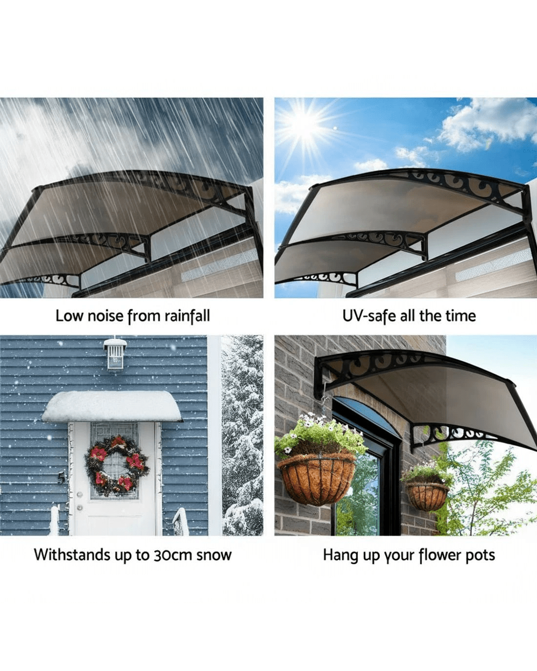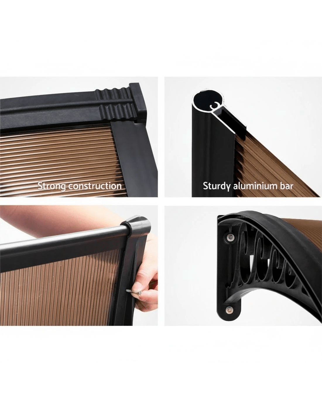 Featuring a durable 5mm thick hollow panel, the window awning is ideal for home or office use and is designed to double up as a door canopy or balcony cover if required. The panel is affixed to sturdy aluminium bars and the entire assembly is corrosion-resistant. Which simply means many good years of all-weather protection(Only for normal weather condition,extrem weather condition is excluded) for your doors and windows. And of course, looking absolutely stylish and modern with your home or office building too.