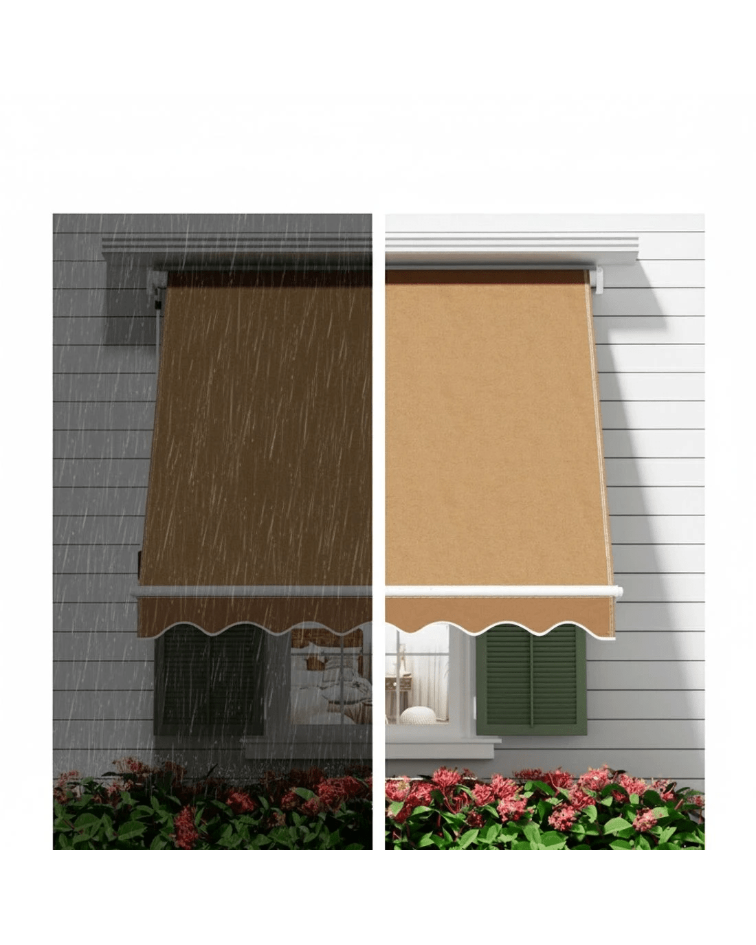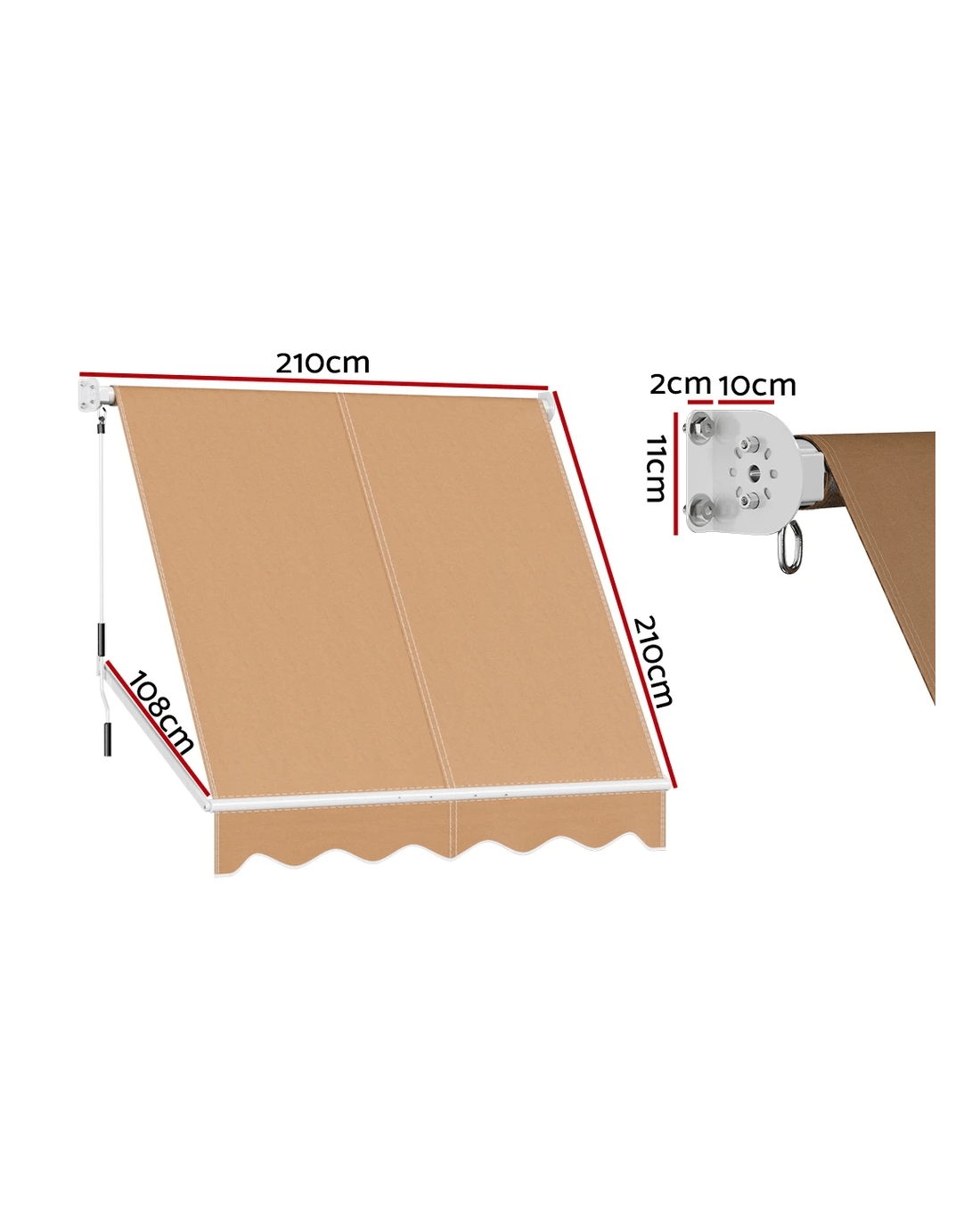 Measuring 2.1m x 2.1m, our Retractable Pivot Arm Awning comprises a sturdy steel frame and high-quality and highly breathable 100% polyester fabric shade. That's means you get good air flow for maximum ventilation and ample cool shading as well. Both frame and shade are made UV and tear-resistant respectively and designed to be durable and longlasting in all kinds of weather conditions(Only for normal weather condition,extrem weather condition is excluded).