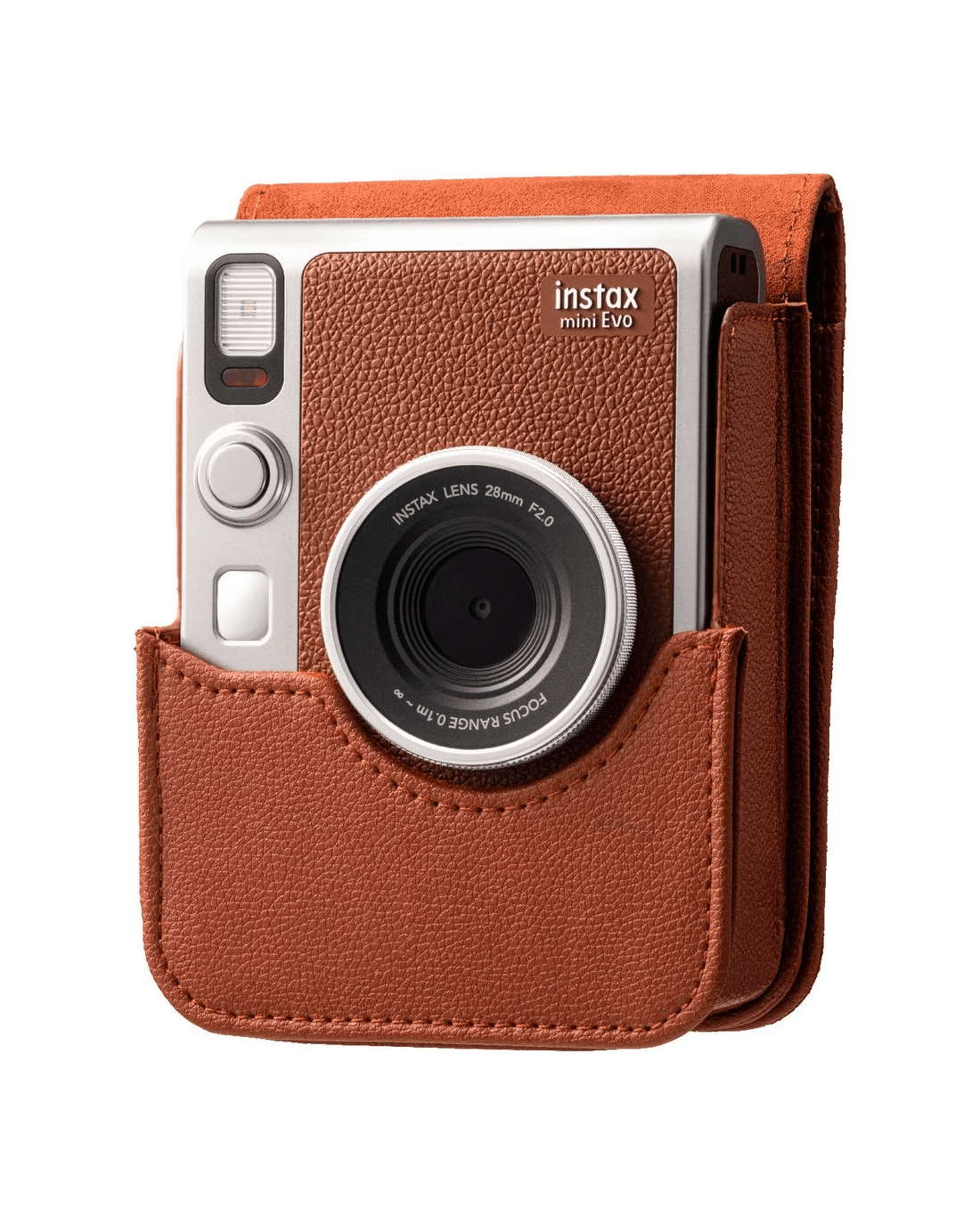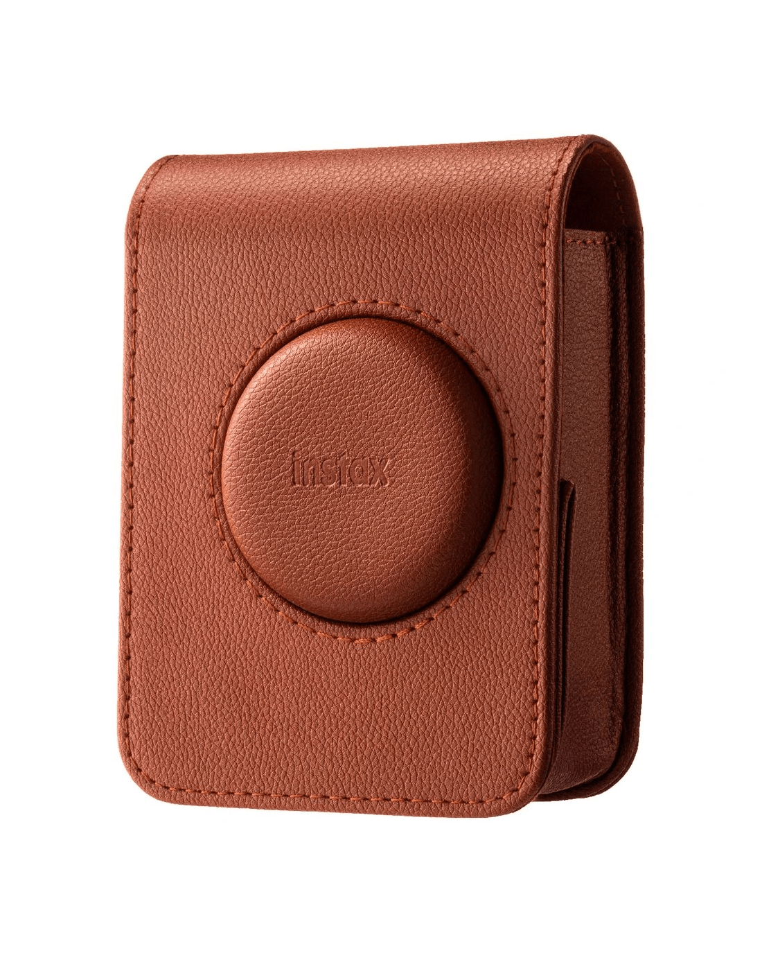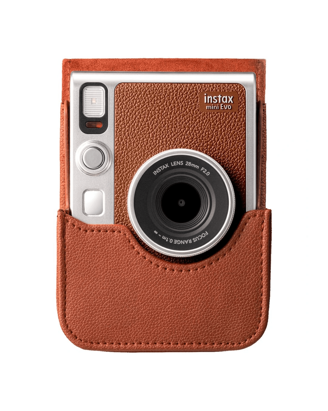 - The camera case comes in brown to match the Mini Evo camera body and features a debossed Instax logo.