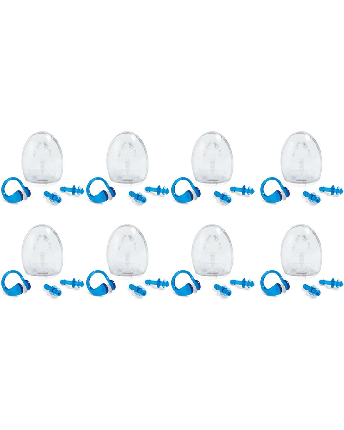 Includes: 8 sets of 3-piece ear plugs and nose clips with case