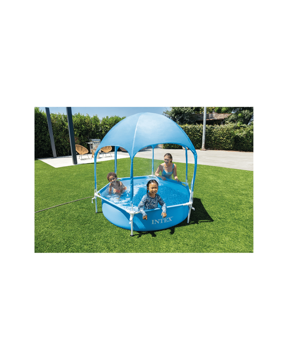 The Intex Canopy Metal Frame Outdoor Pool is designed for safe and enjoyable water play for children. Perfect for backyard use, this pool combines durability, convenience, and sun protection to ensure a fun summer experience.