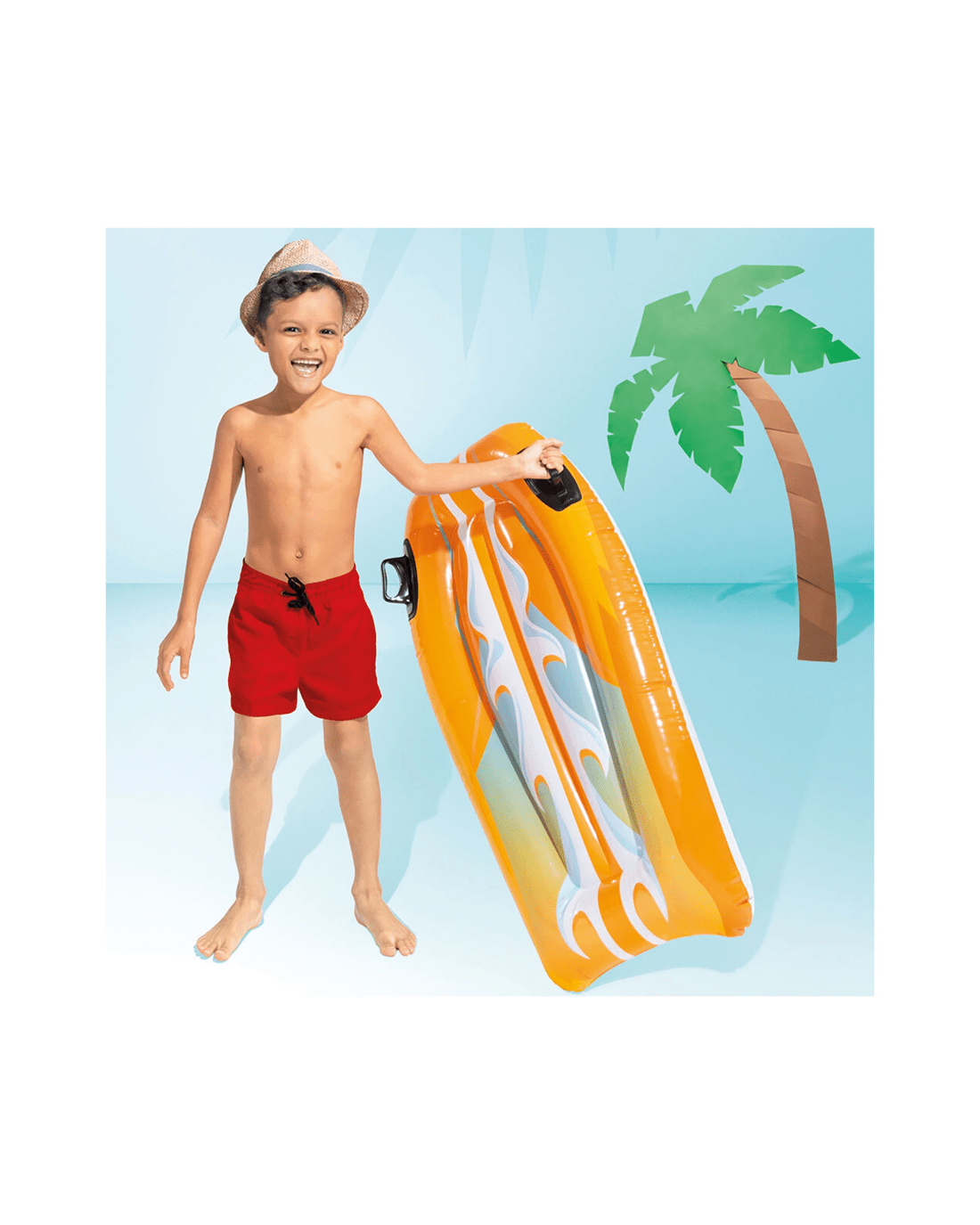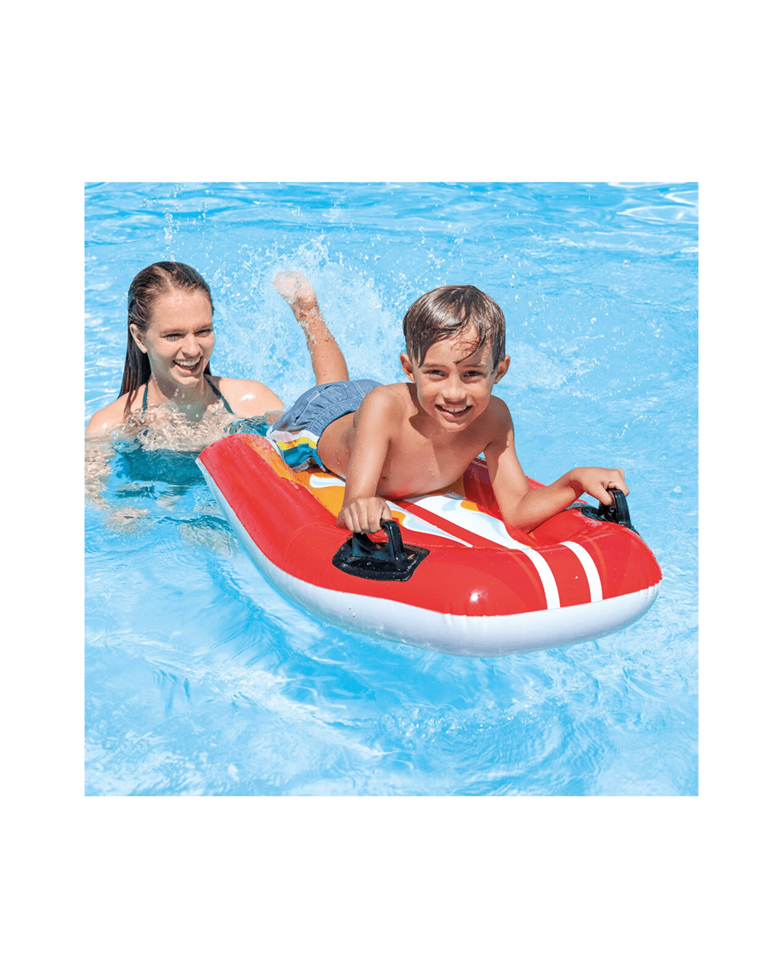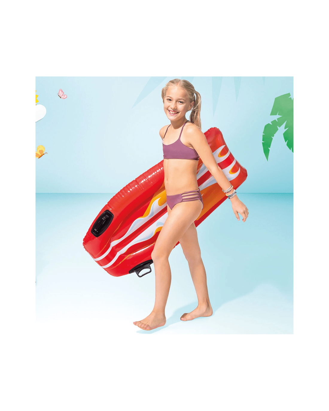 This float features vibrant graphics that appeal to kids and comes equipped with practical safety features including dual air chambers and dual handles for stability and easy handling. A repair patch is included for convenience, ensuring long-lasting use. Suitable for all children aged 6 and over, it provides a secure and enjoyable water experience.