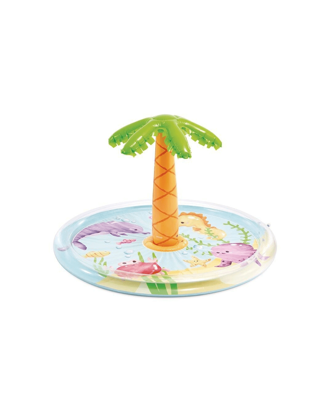 - Features: Light sprayer attaches to garden hose, vibrant sea creature liner, palm tree decorative feature