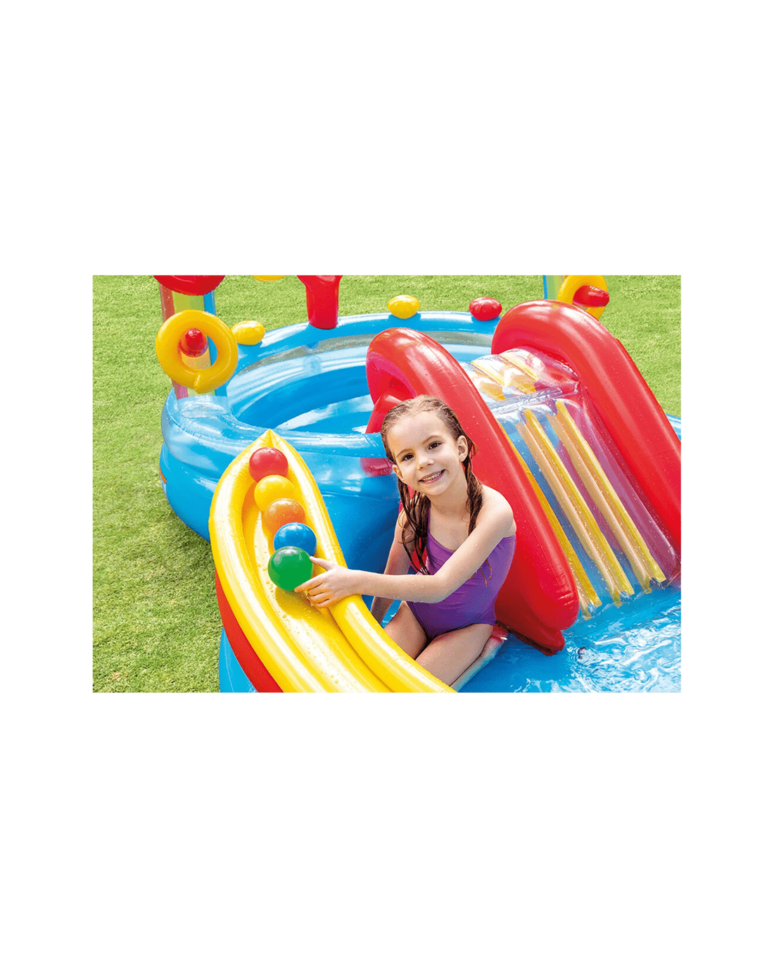 - Includes: Water slide, wading pool, water sprayer, ring toss game with four inflatable rings, ball roller game, toss ball game, and six Fun Ballz