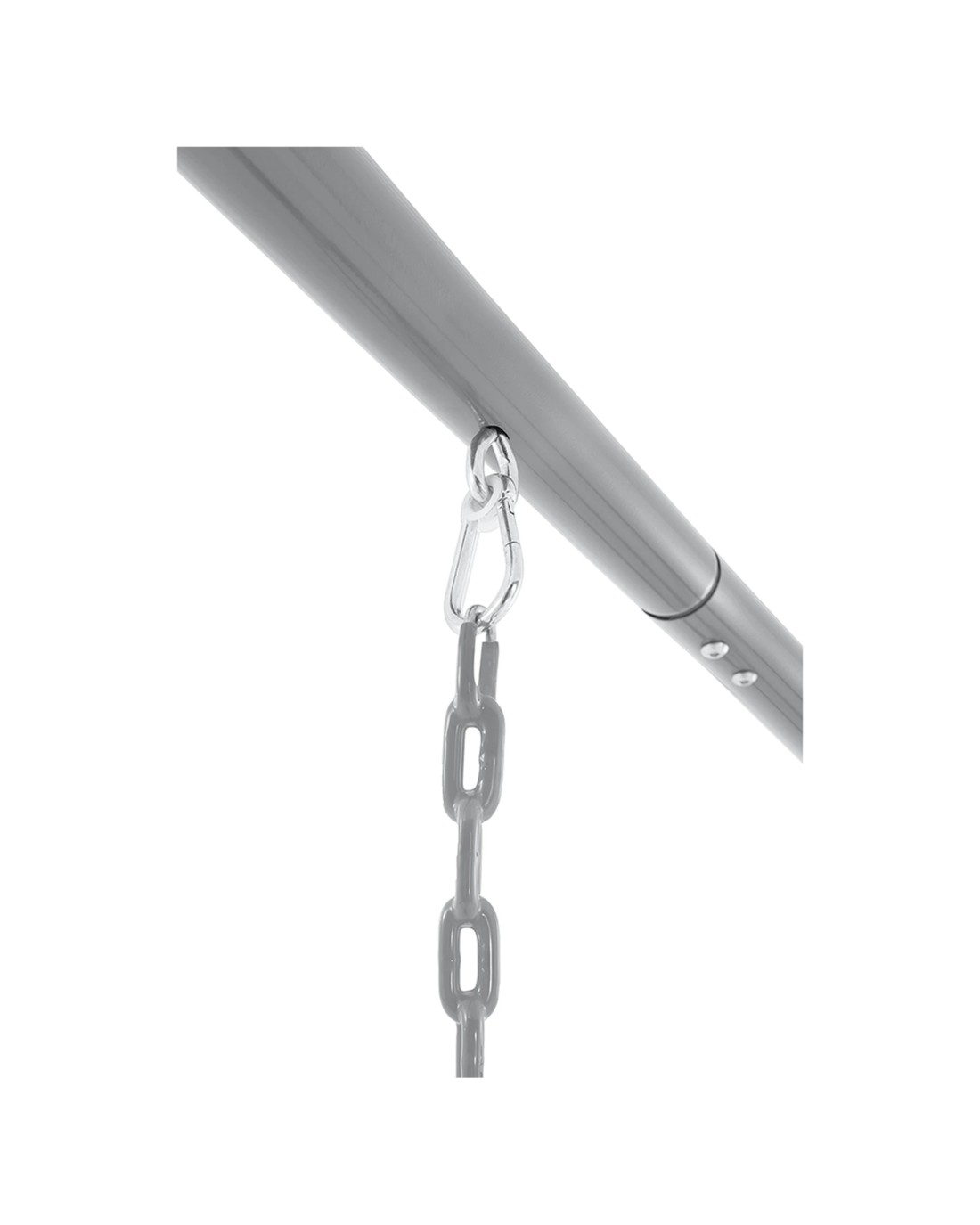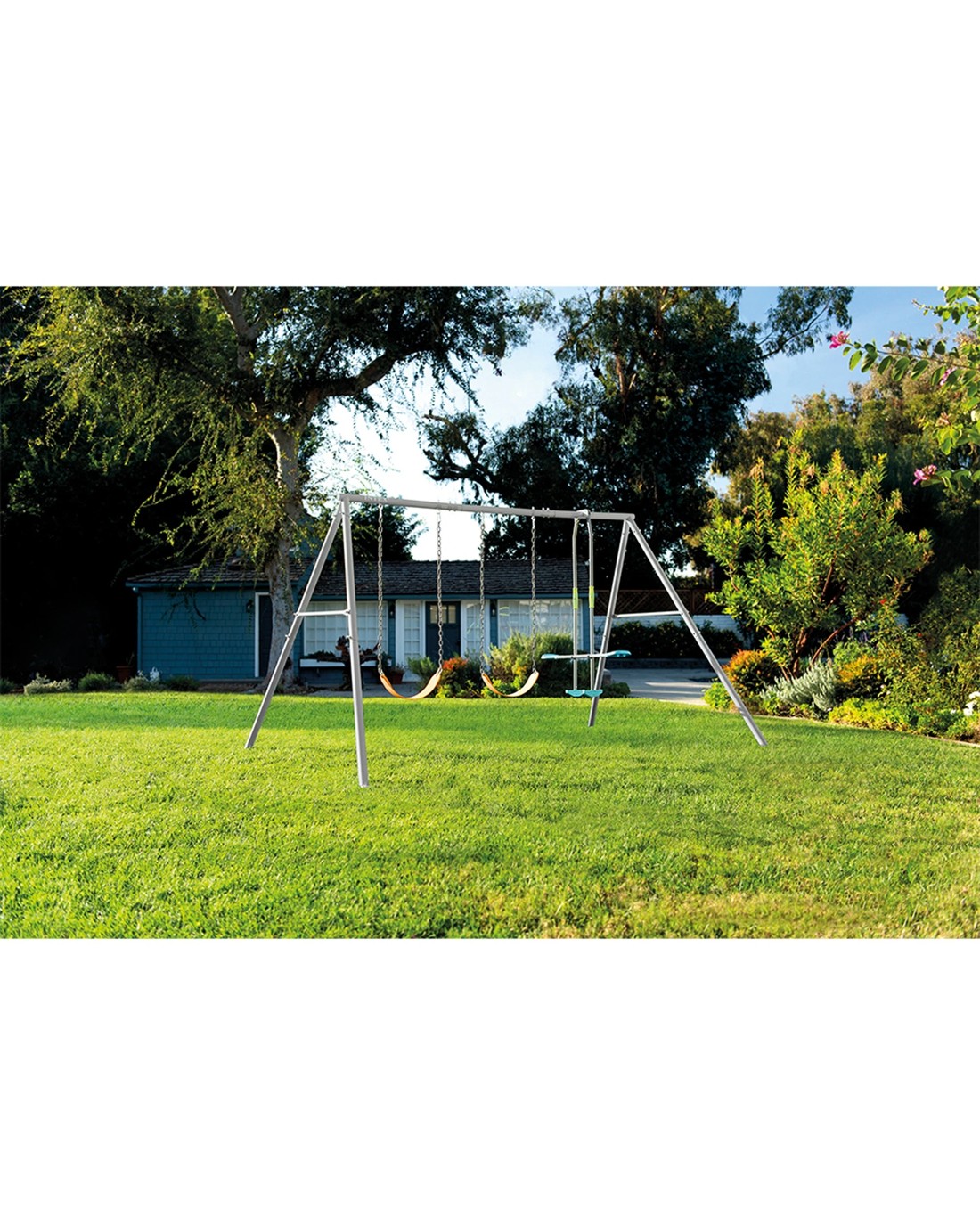 This swing set features a galvanised steel frame with a large 2 3/8 inch diameter tubing, laser welded for strength and longevity. The weather-resistant construction ensures it withstands outdoor conditions, making it a reliable choice for family fun.