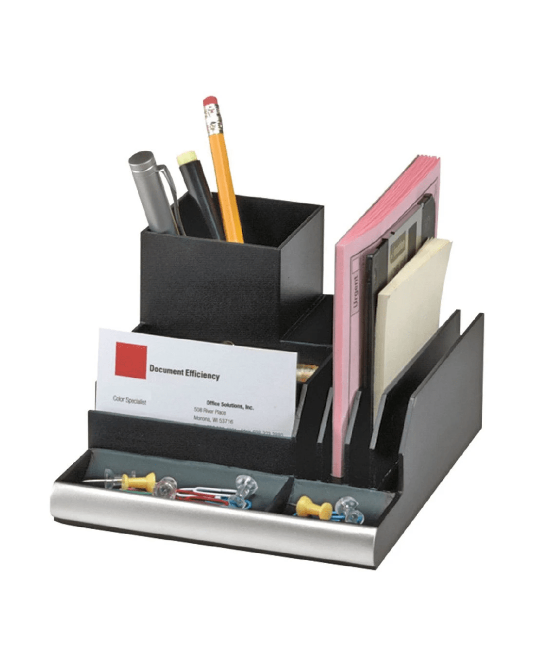 - This organiser has space for writing utensils, business cards and more.