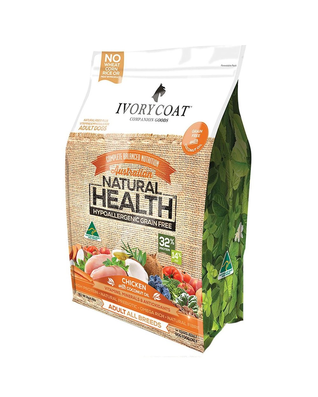 Packed full of wholesome, natural ingredients to support the long term health of your adult dog. This all-natural, grain free dry food is formulated using Australian chicken meal, vegetables and coconut oil making it an excellent source of highly digestible protein and energy. Ivory Coat recipes are made in Australia from high quality, Australian-sourced ingredients and are rich in antioxidants from super foods like kale and blueberries to support a healthy immune system. With the addition of flaxseeds and salmon oil they are rich in omega fatty acids for skin and coat health and also contain a natural pre-biotic and natural fibre to support healthy digestion.