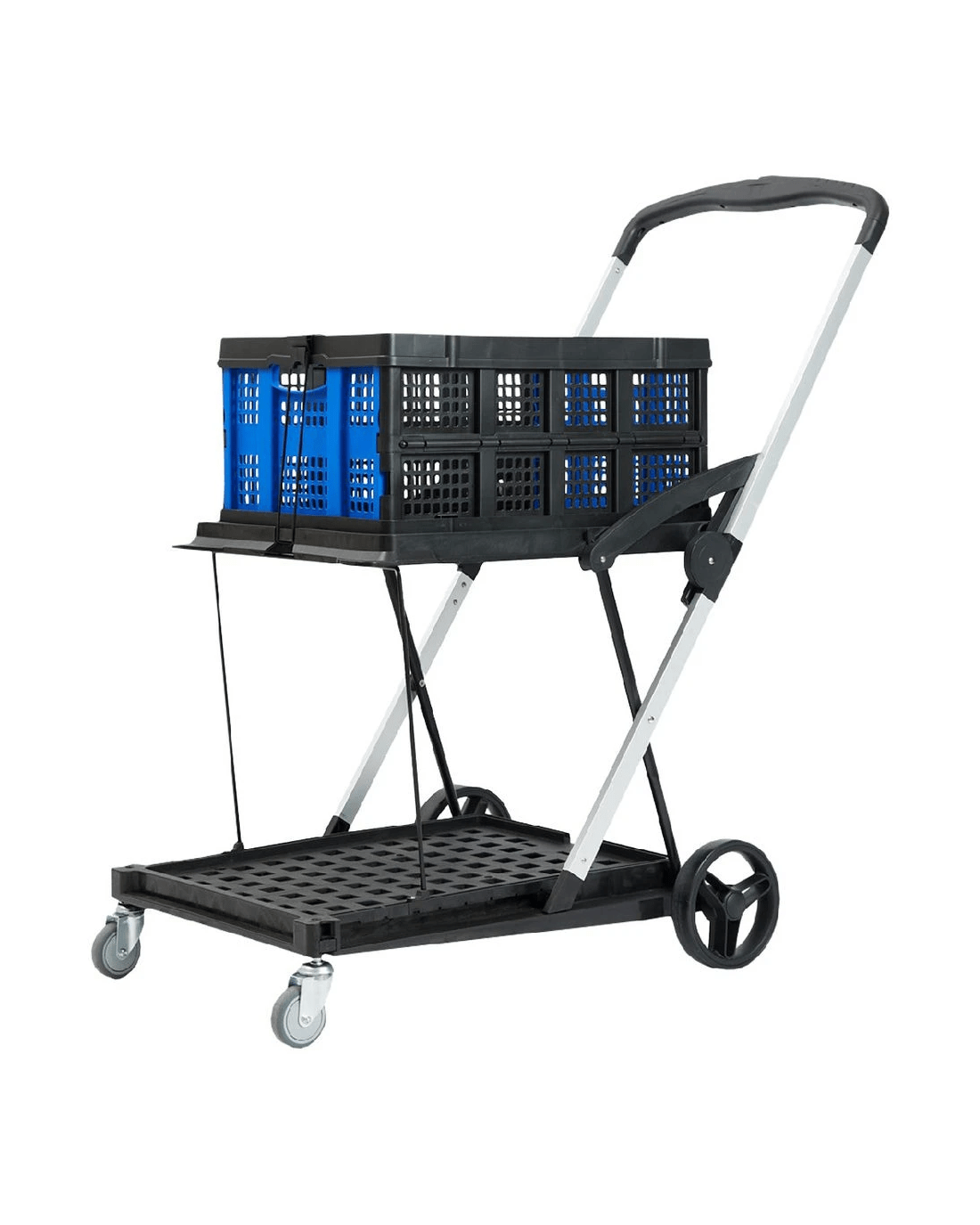 - It comes with a collapsible crate that attaches securely to the cart for extra storage space.