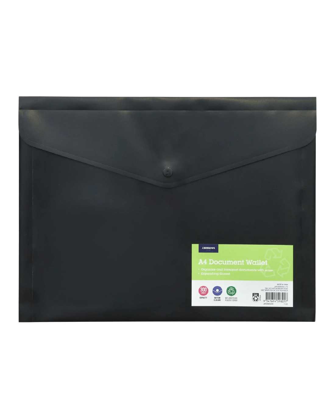 Sold by OfficeworksJ.Burrows A4 Button Document Wallet Black