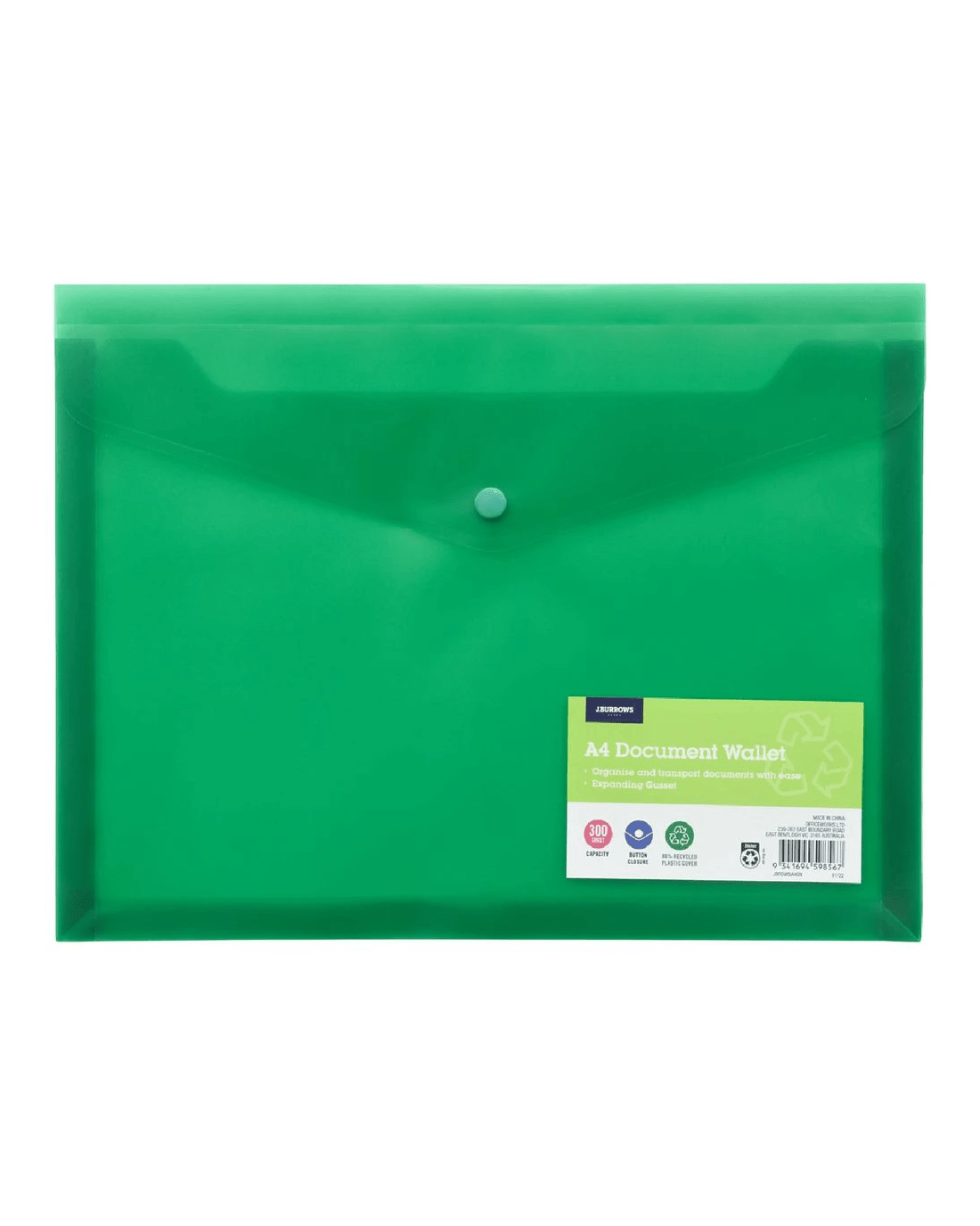 Sold by OfficeworksJ.Burrows A4 Button Document Wallet Green