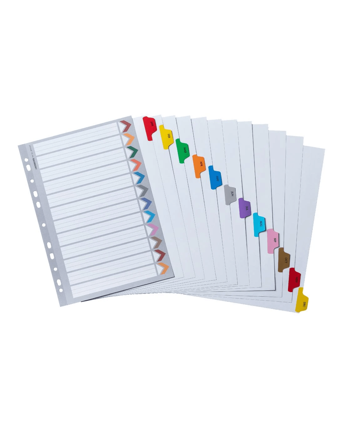 - Each divider has monthly tabs from January to December.