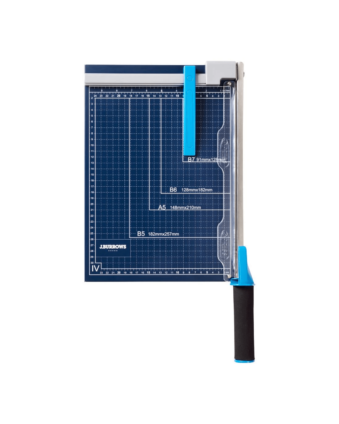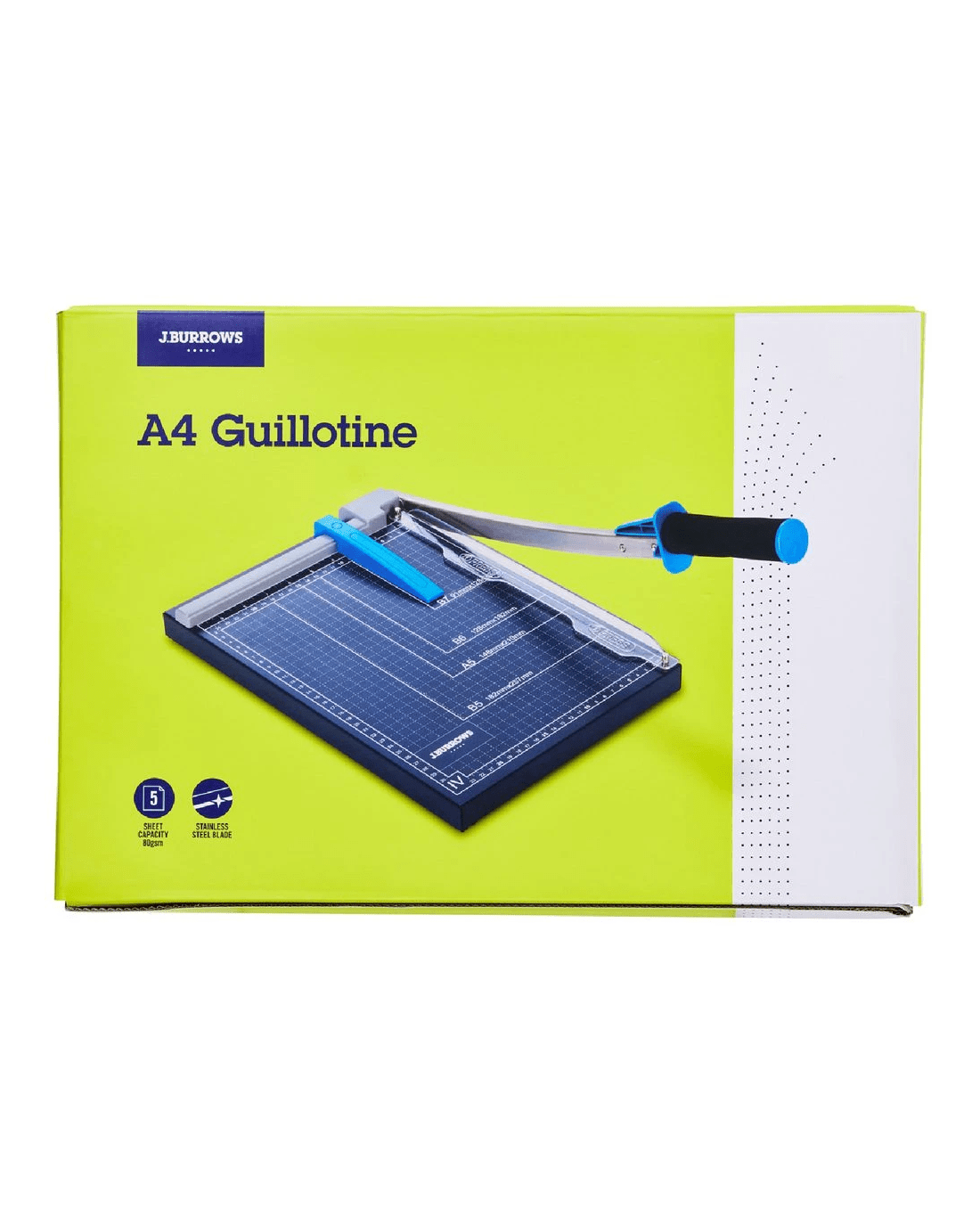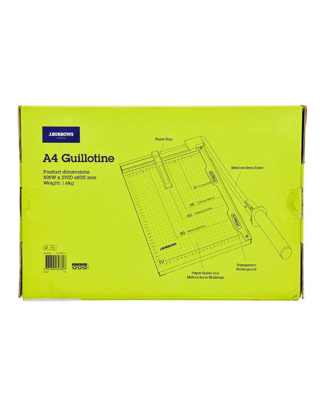 This J.Burrows A4 Paper Guillotine is great for cutting paper accurately, ensuring you get the most precise cut every time. Featuring a robust, steel plate and convenient table-top design, it's suitable for trimming to 5 sheets of A4 80 gsm paper at a time. It provides metric measurements with a maximum cutting length of 320 mm and includes a clear acrylic safety guard for added protection.
