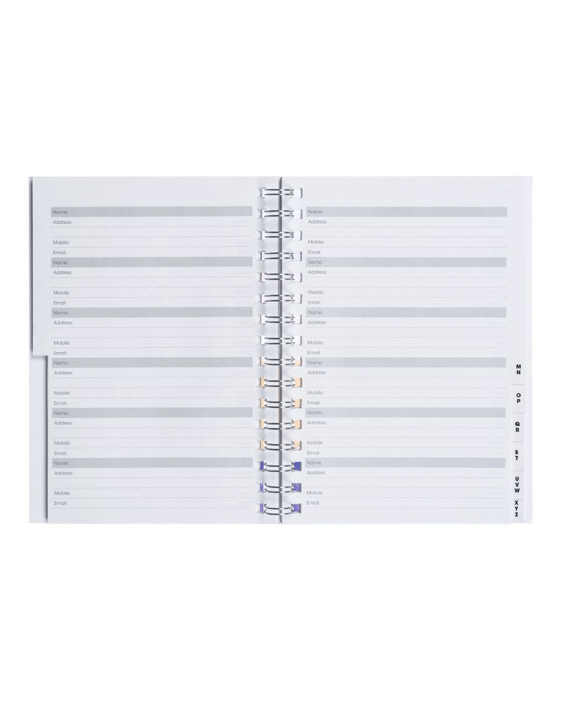 - The pages feature a pre-printed layout for simply filling in contact details.