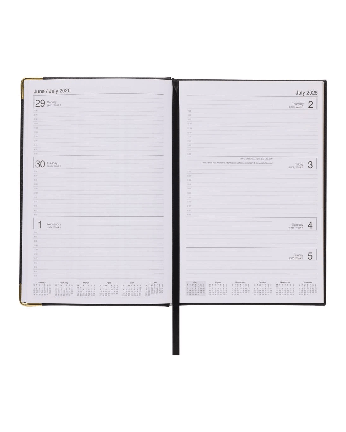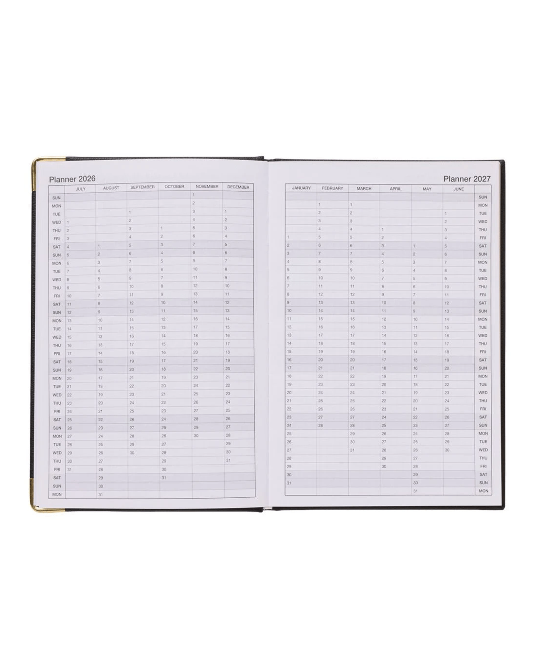 This J.Burrows Elite Diary helps you plan and schedule in style with its simple yet sophisticated design and metallic detailing. It features a dated page layout as well as both national and international public holidays. Find your place with the page ribbon and feel good thanks to the hardcover protecting your pages.