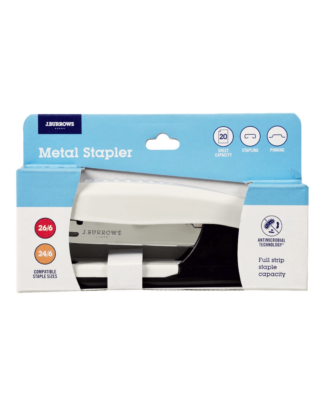 Sold by OfficeworksJ.Burrows Antimicrobial Metal Full Strip Stapler White