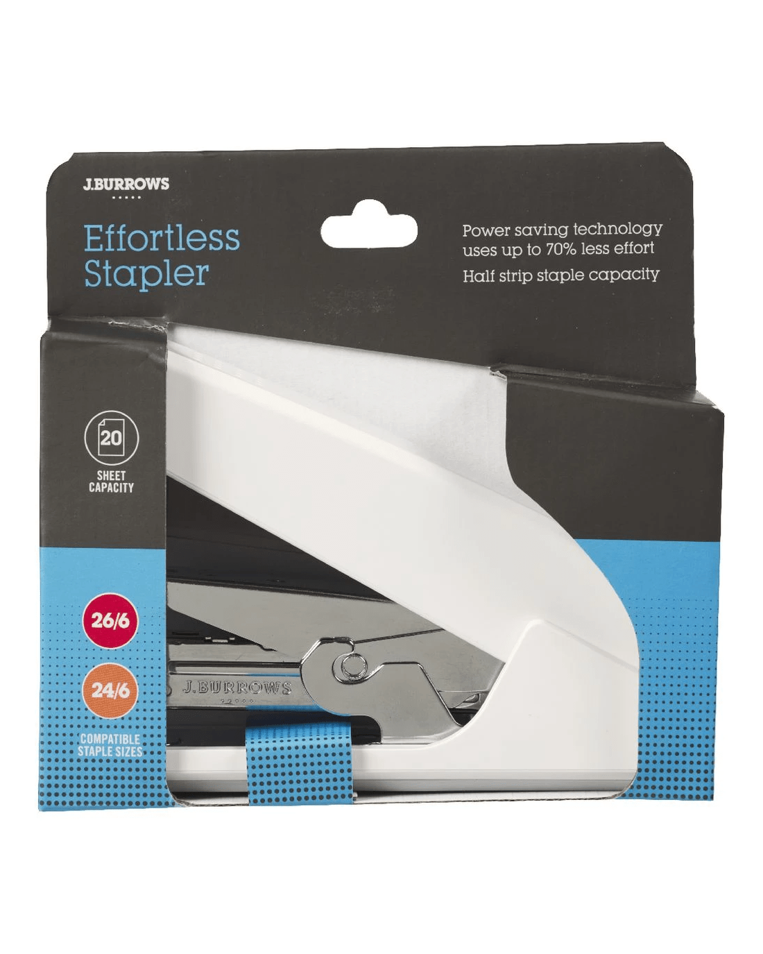 This J.Burrows Effortless Stapler makes completing your stapling tasks easier. It requires 70% less pressure to be applied than standard staplers so you can staple documents and papers using only 1 finger. This stapler also features a non-slip rubber base so it won't move around while you're trying to use it.