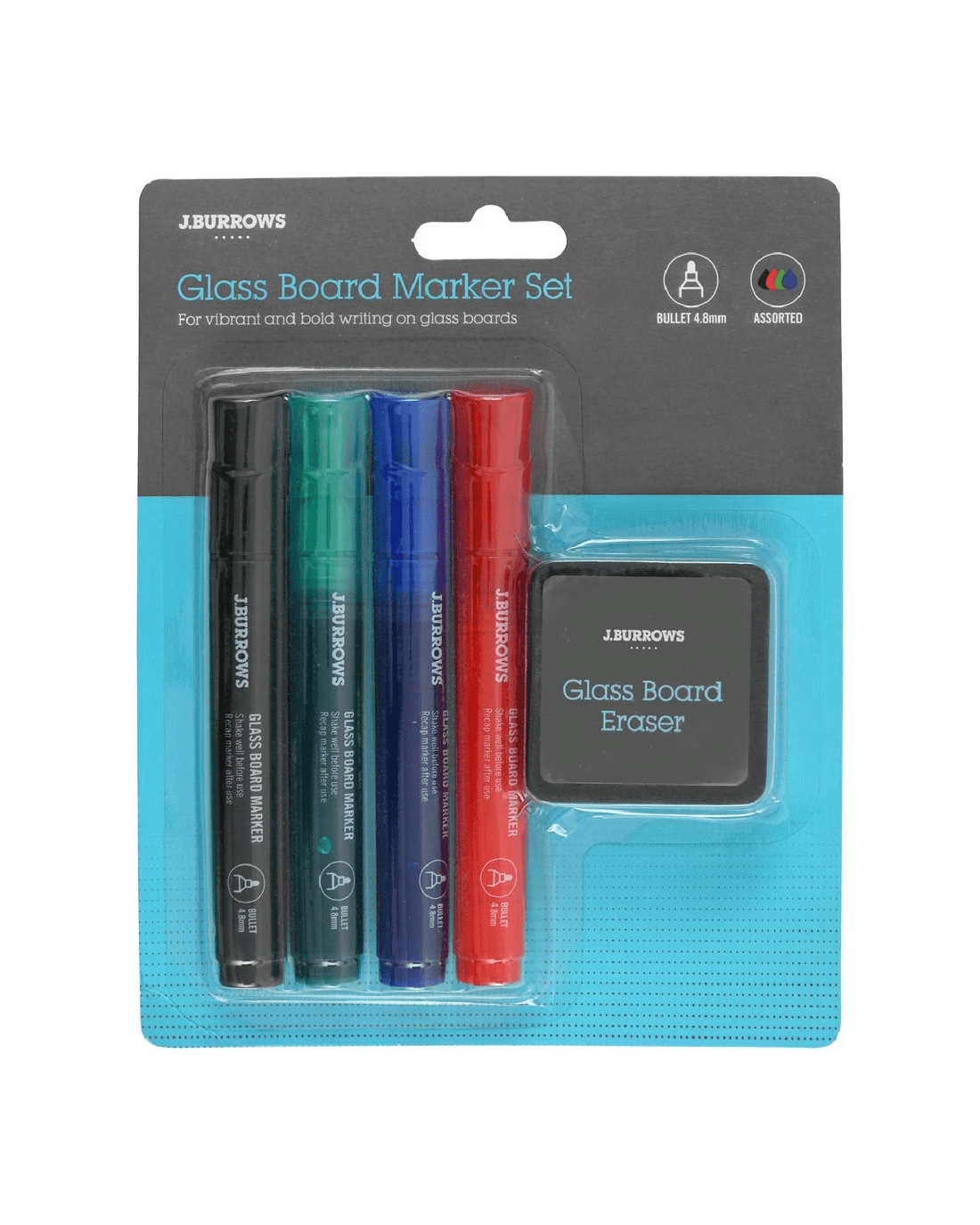 This J.Burrows Glass Board Markers & Eraser kit is a functional addition to your home or workspace. The markers are designed to write on glass boards and can be used again and again thanks to the included eraser.