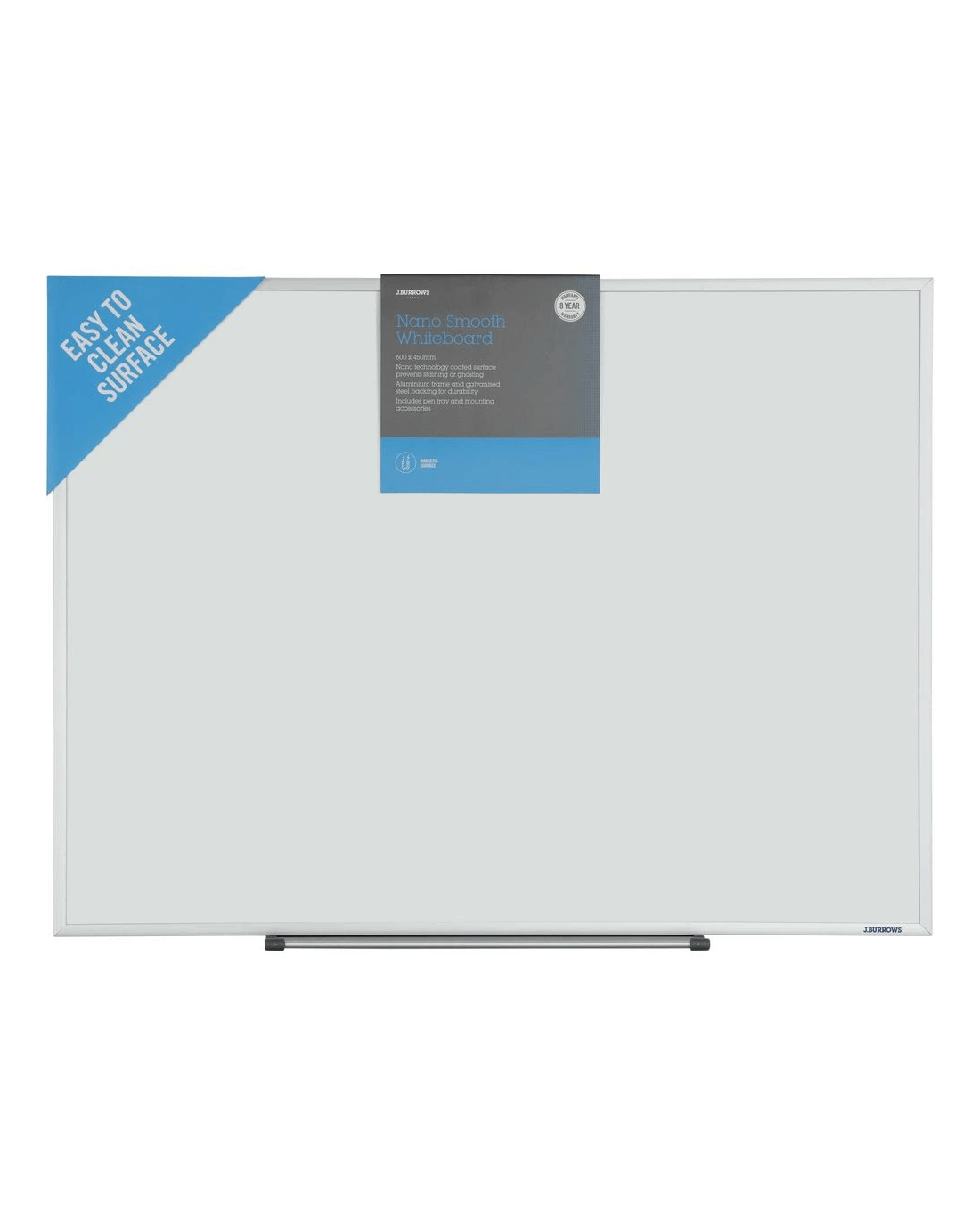 This J.Burrows Nano Smooth Whiteboard has a magnetic, dry-erase surface. The Nano Smooth Technology coats the surface and prevents ghosting and staining, allowing it to withstand heavy duty use. It is magnetic so it can act as a note-taking surface and a noticeboard all at once.