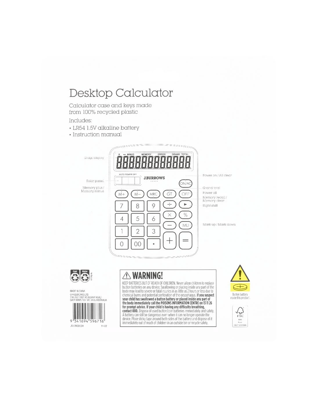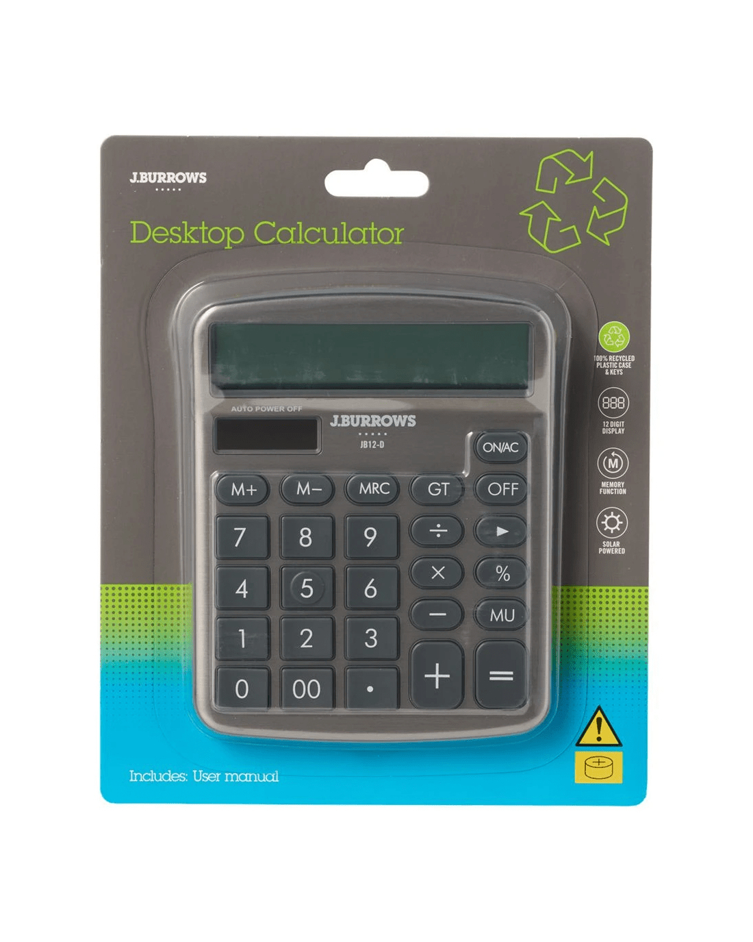 This J.Burrows Recycled Desktop Calculator is perfect for making basic calculations at home, school or work. It features a 12 digit display and comes with an included battery for your convenience. It's made using recycled ABS, silicone and metal materials, so you can equip your workspace in an environmentally conscious manner.