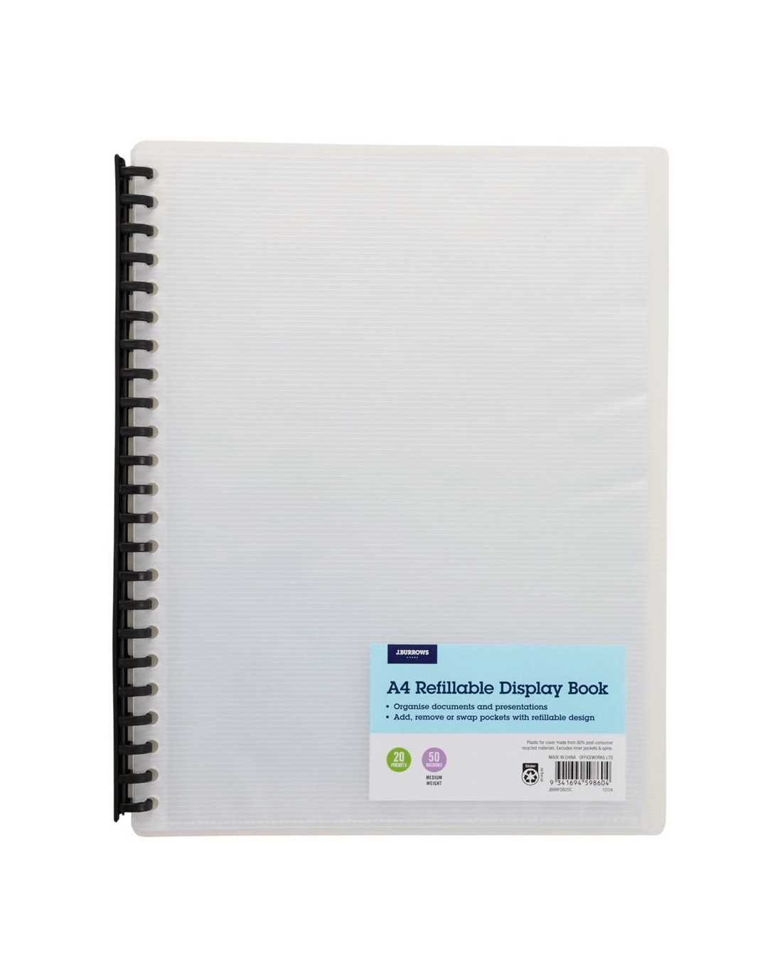 J.Burrows Refillable Display Book 20 Pockets Clear