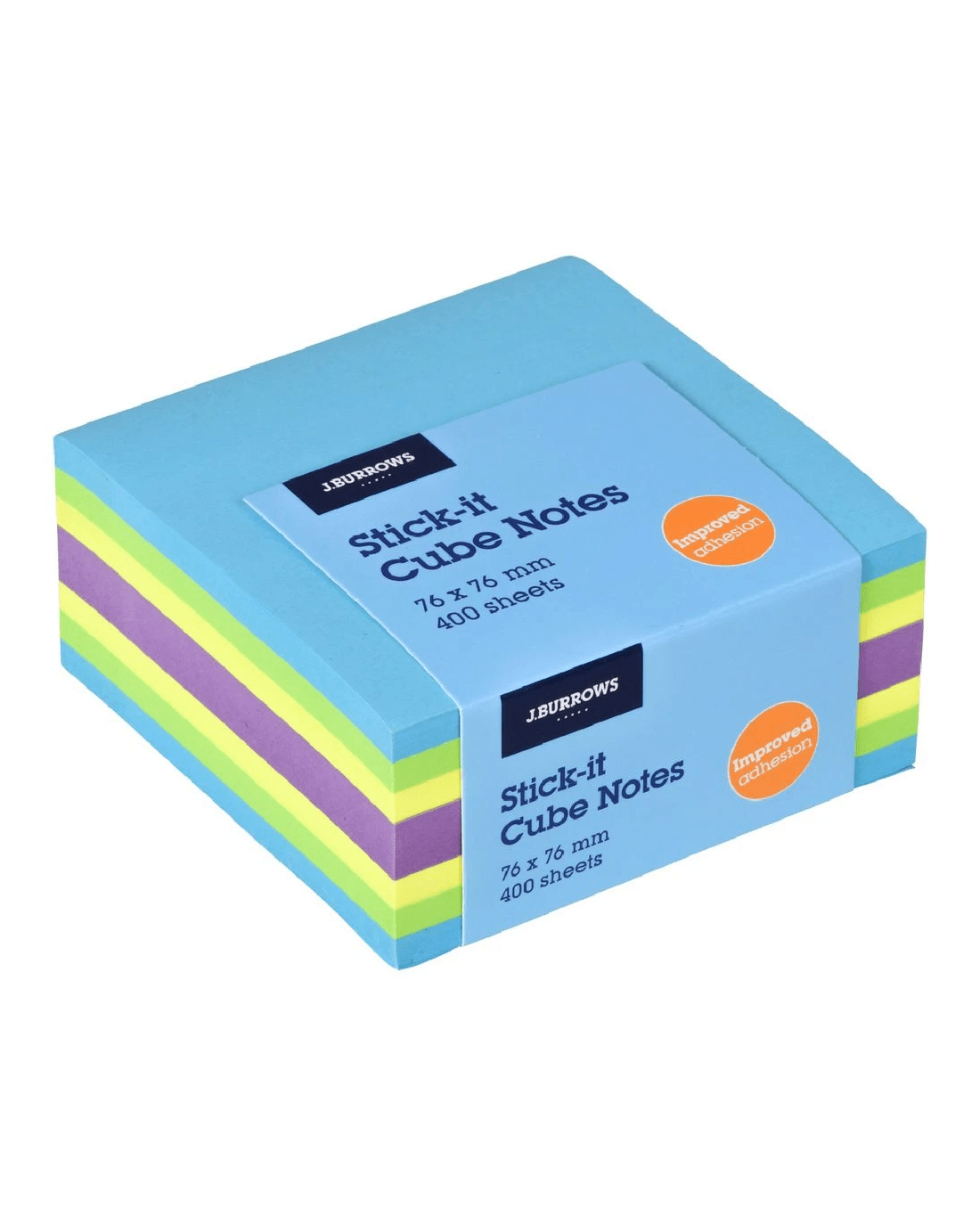 J.Burrows Stick-It Notes are perfect for use in the home or your workspace to take messages, write to do lists and more. Each note has a strong self-adhesive backing which is suitable for use on almost any smooth surface and can be removed without leaving any sticky residue behind. This cube is made up of 8 pads of 50 sheets.