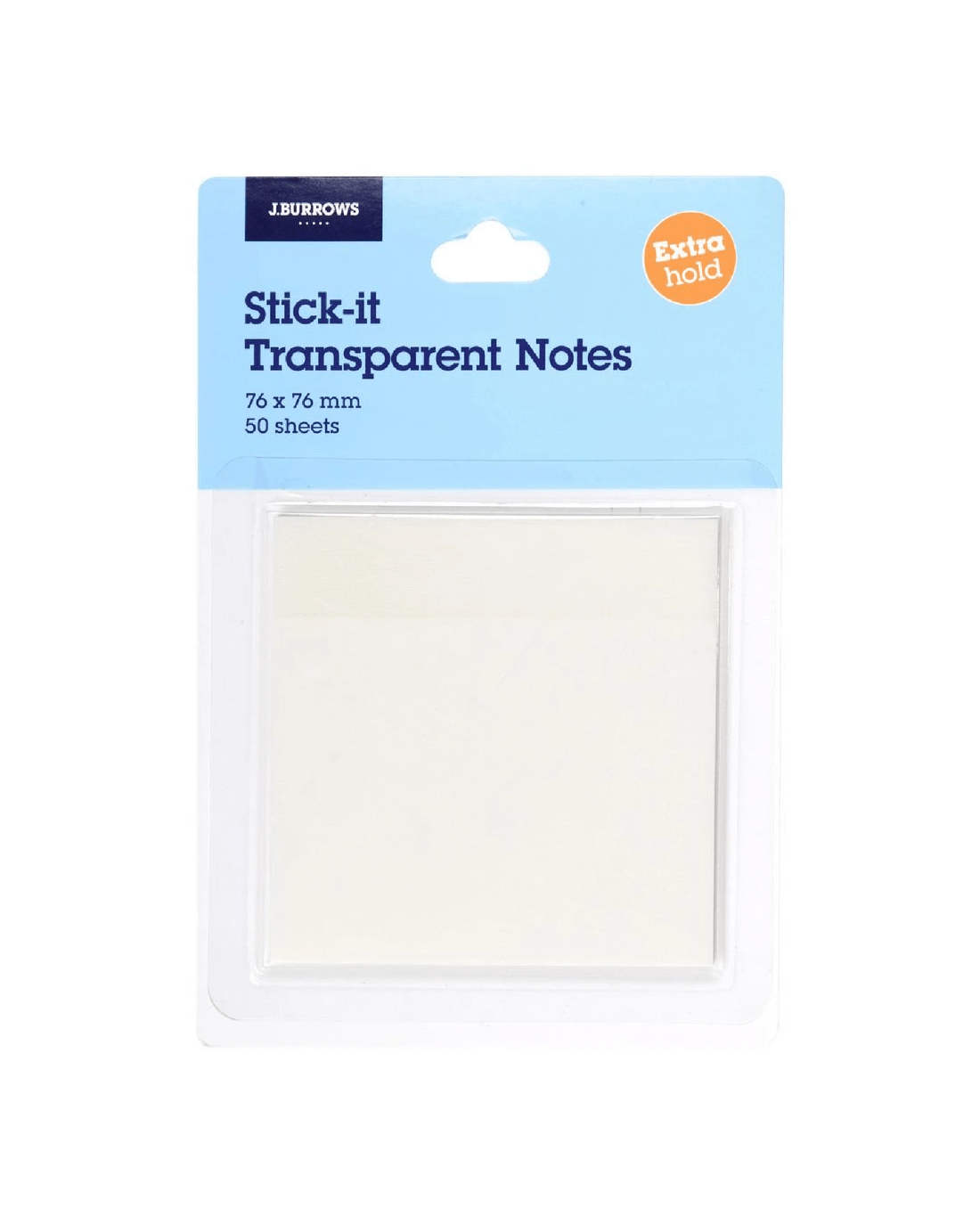 These J.Burrows Transparent Stick-It Notes are a great study tool. Use them to add comments and highlights without writing directly on the page or stick them to your textbook to copy complex diagrams to help with exam revision. Each note measures 76 x 76 mm with an adhesive strip on one edge and there are 50 notes in the pack.
