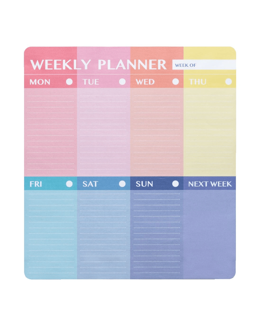 This J.Burrows Weekly Planner is a great resource for home or the workspace as it allows you to plan out your weeks in advance. It is self-adhesive so you can stick and reposition it if you desire.