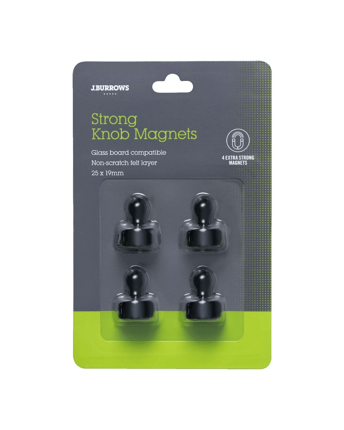 These J.Burrows Strong Magnets are a great option for holding, storing, and displaying documents and photos on any magnetic surface. The pack contains 4 magnets with a strong hold and a unique knob shape.