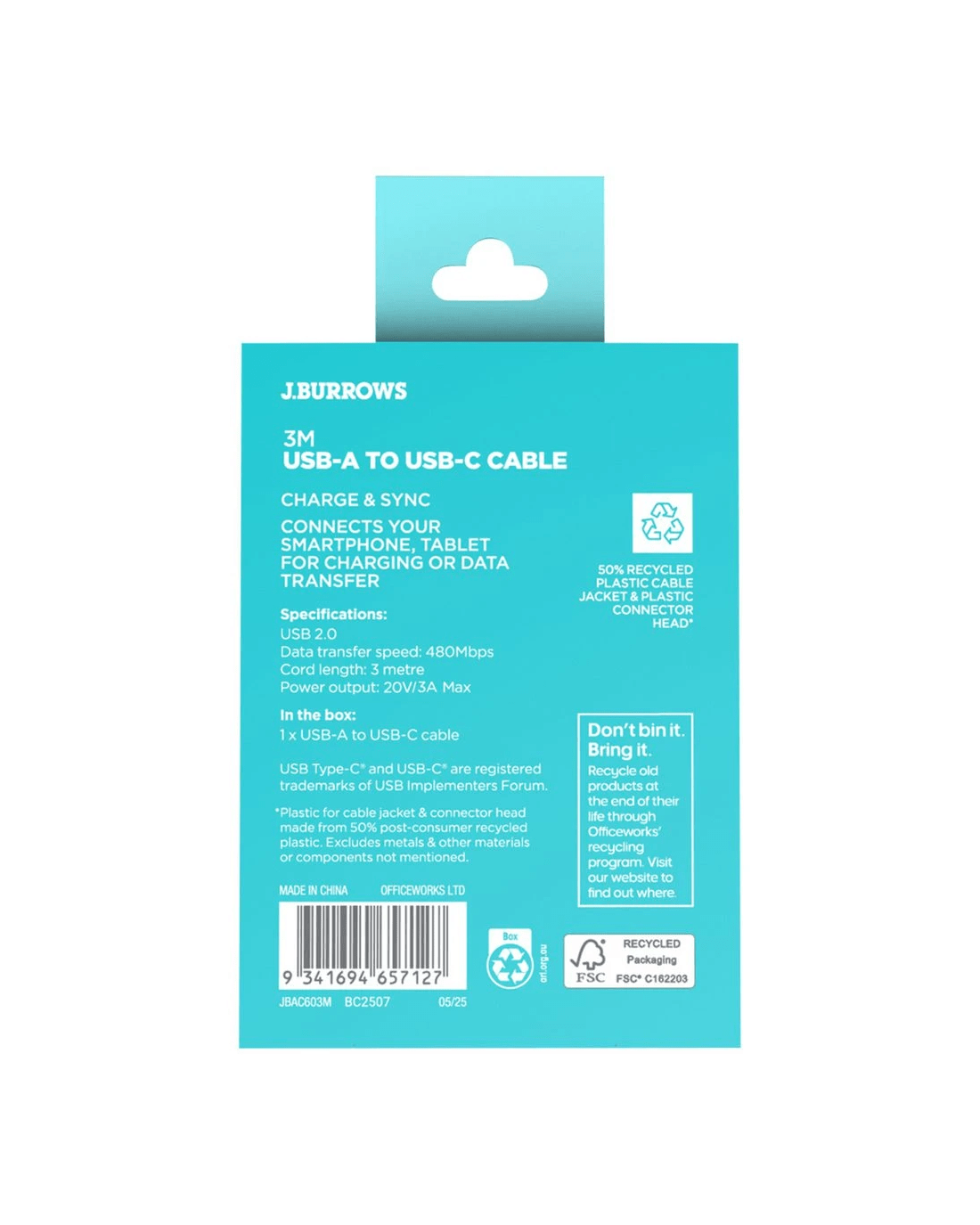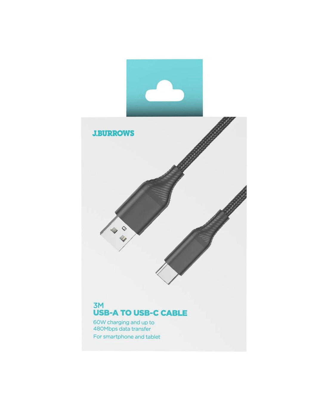Keep your devices charged with this J.Burrows USB-A to USB-C cable. It's 3m long and can be used to connect devices with a USB-C port to a computer or charger with a USB-A port. Plus, you can use it to charge your devices or sync data from your device to your computer.