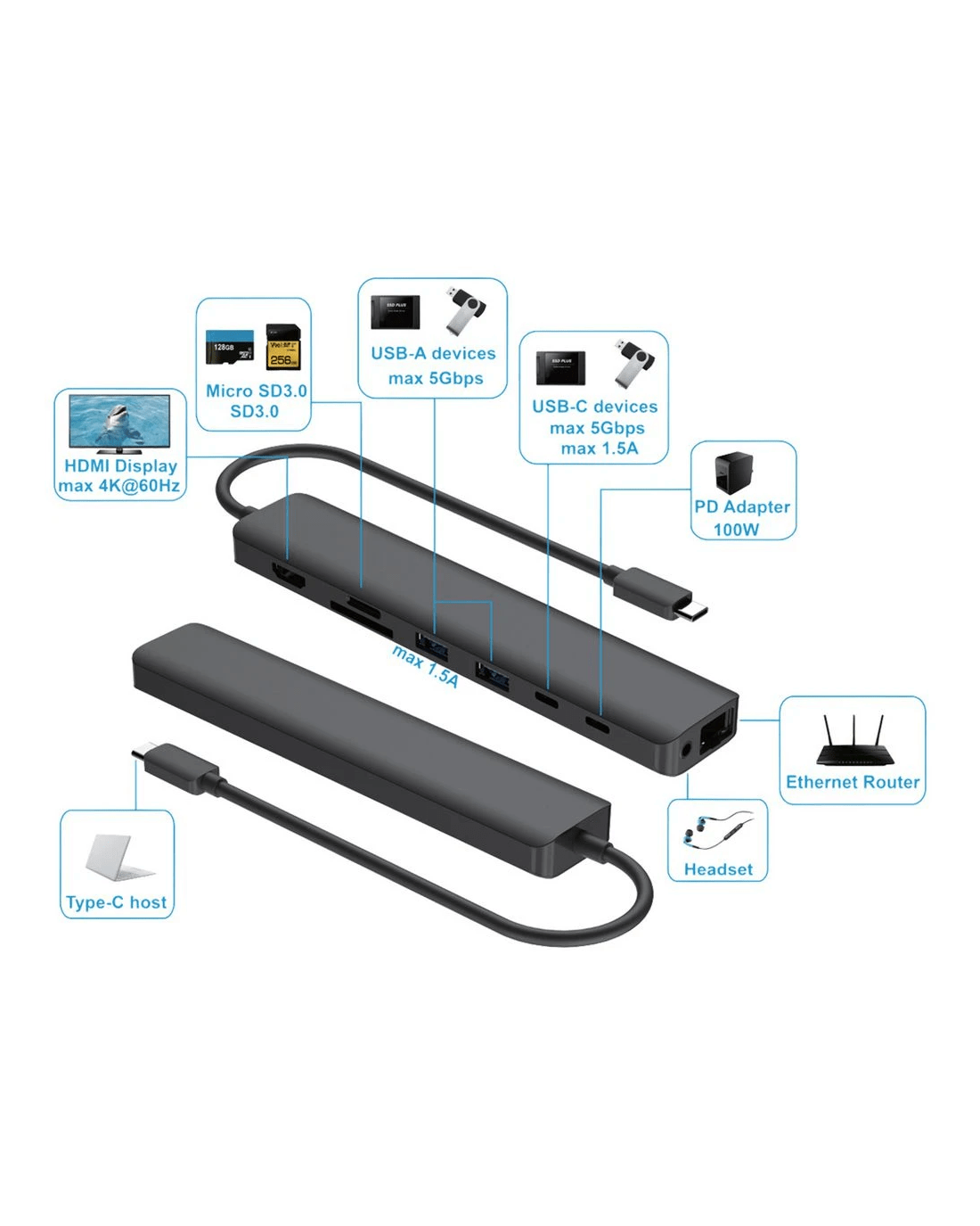 - This Hub has 9 ports: 1 x 4K HDMI (supports DP1.4 Alt mode), 2 x USB-C, 2 x USB-A, 1 x RJ45 ethernet port, an SD/TF card reader and a 3.5 mm audio jack.