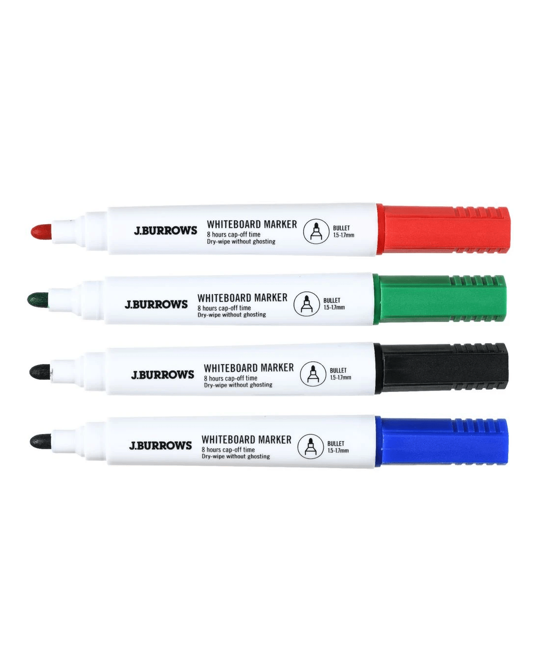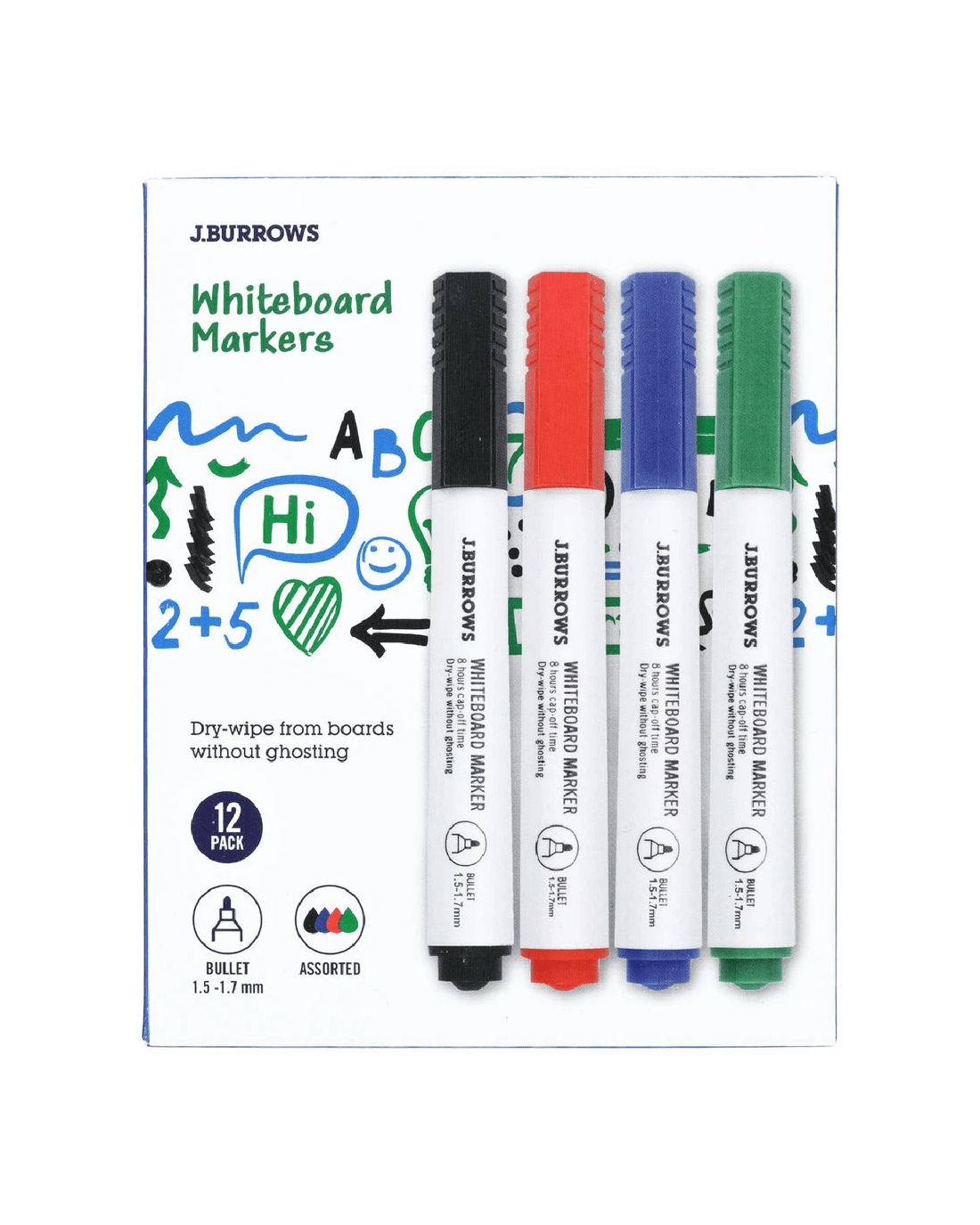 These J.Burrows Whiteboard Markers are perfect for making erasable notes on whiteboards and other dry-erase surfaces. The markers are quick-drying and feature a bullet nib for precise writing and drawing. This set has 12 assorted colour markers.