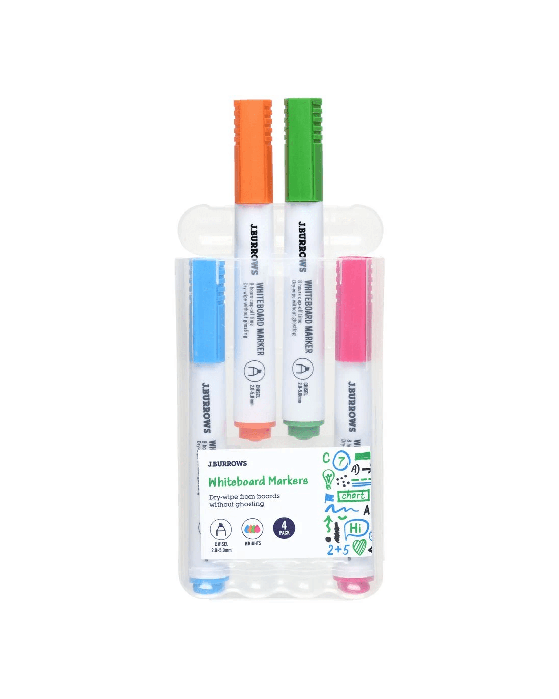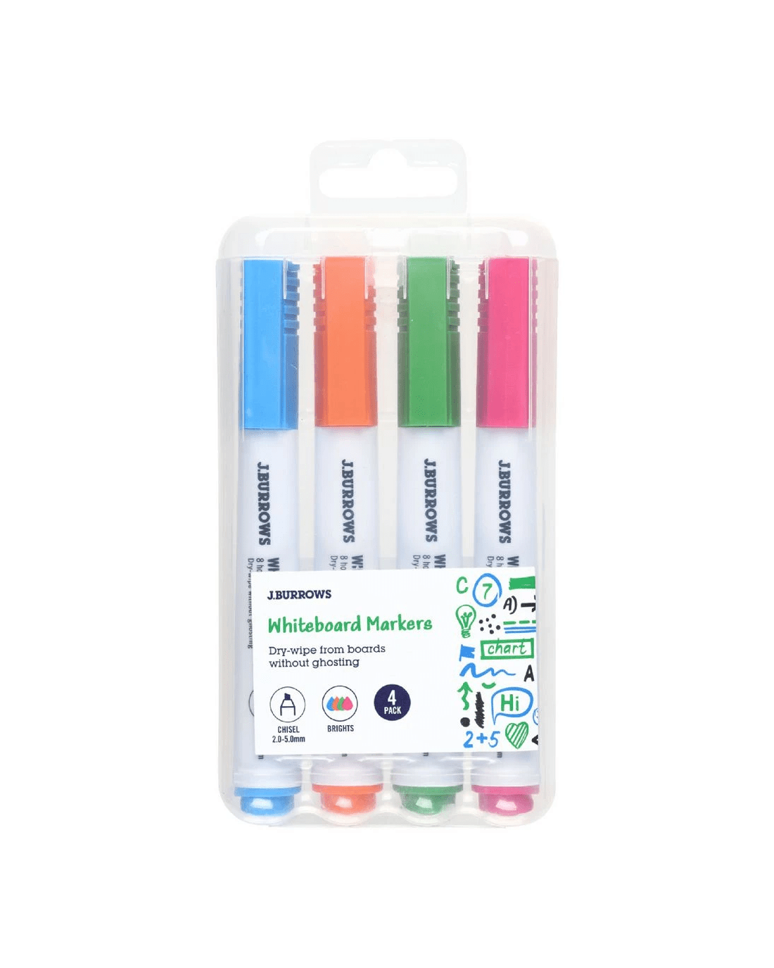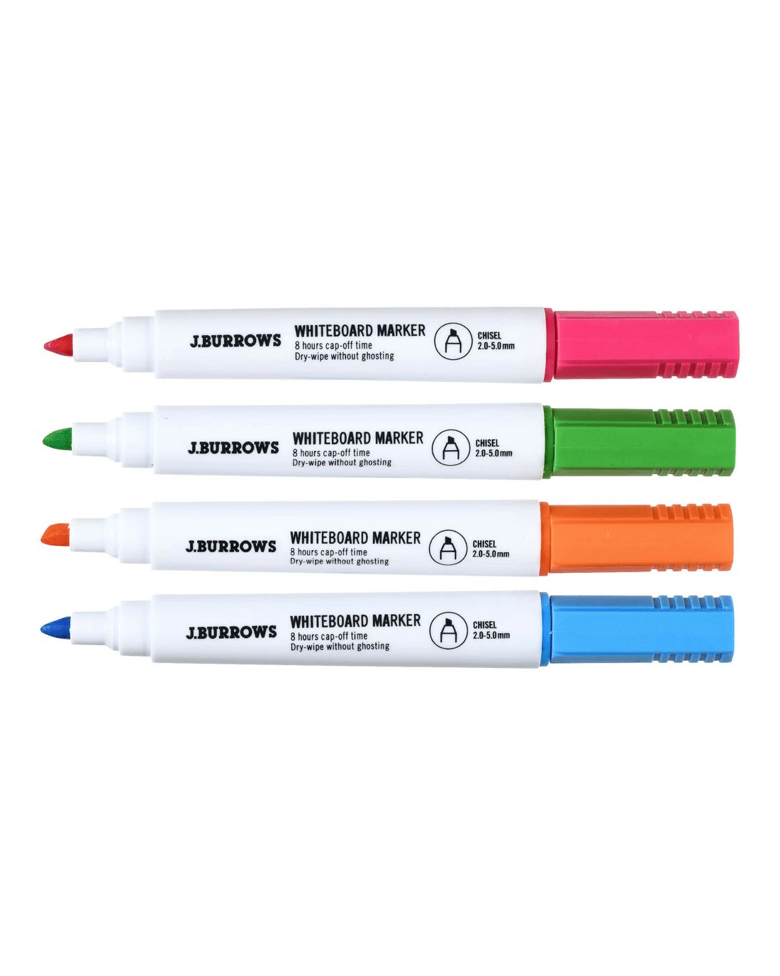 These J.Burrows Whiteboard Markers are perfect for making erasable notes on whiteboards and other dry-erase surfaces. The markers are quick-drying and feature a chisel nib for creating different size lines This set has 4 assorted bright colour markers.