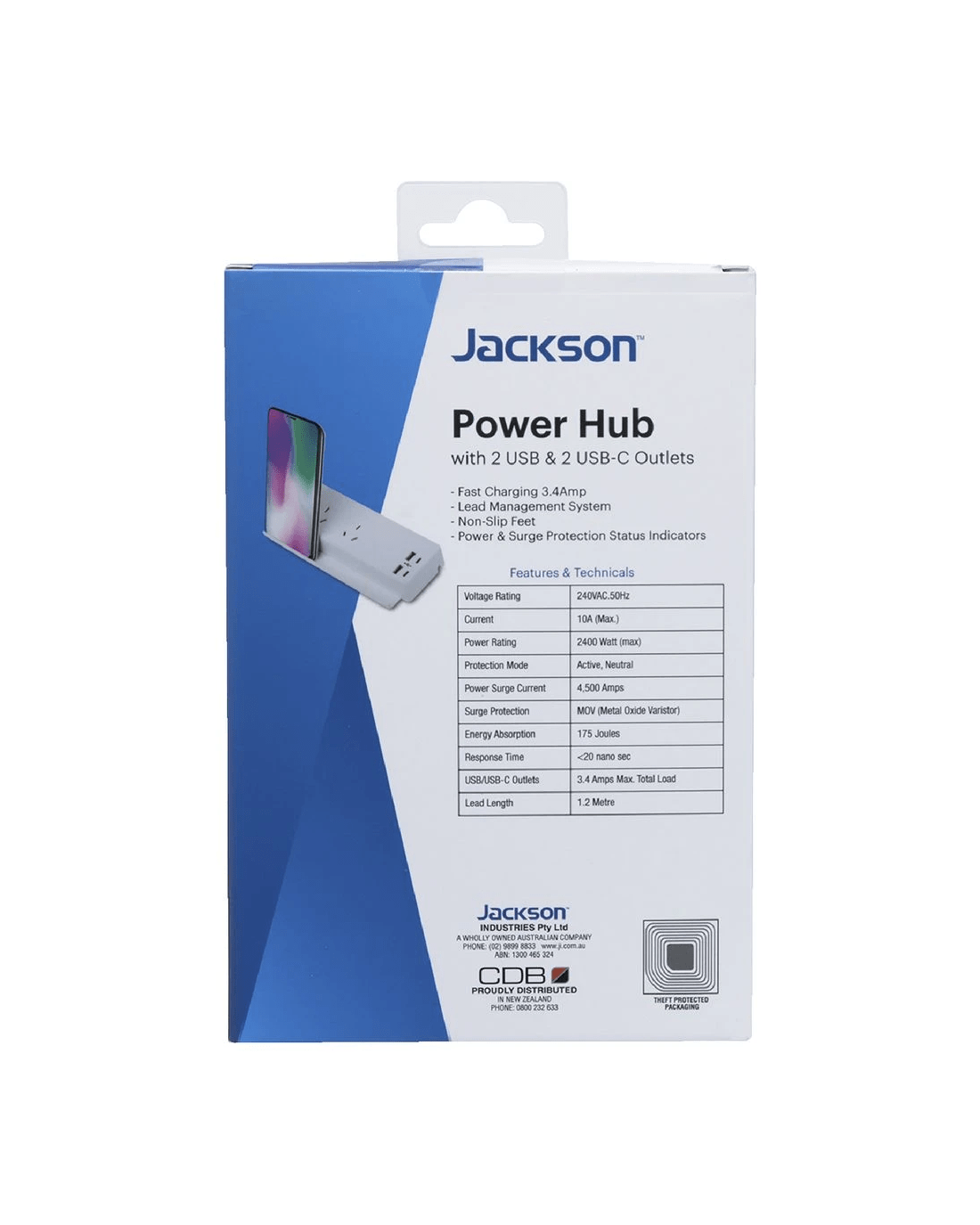 This smart little Jackson Power Board sits neatly on your desk and is packed with the latest technology and features to power and protect your equipment. Utilising the latest in charging technology, you can Fast Charge 2 USB-C devices, and 2 USB devices simultaneously and the built-in device stand lets you keep your device in view whilst charging. Built-In Surge Protection protects your valuable equipment from unexpected power surges. This Power Hub sits proudly on your desk, with non-slip feet and built in cable management system that allows you to exit the cable where you need it