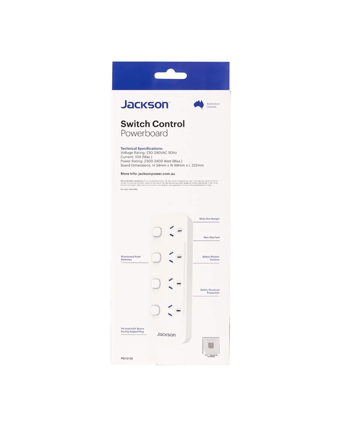 This Jackson 4 Outlet Overload Switched Powerboard is ideal for use in your home or workspace, instantly expanding your power capacity. Each outlet is individually switched, allowing you to choose which appliances you want to be on and switching off the ones you don't. This powerboard features Safety Overload Protection, protecting your equipment from overheating and tripping the power for added peace of mind.