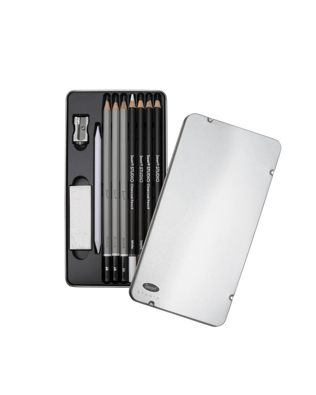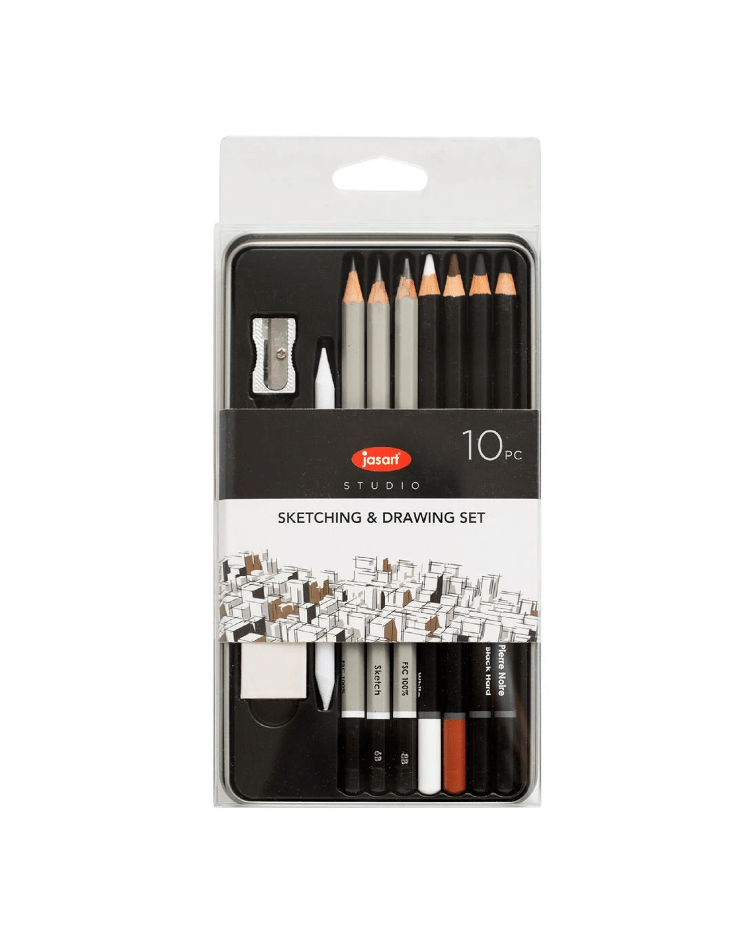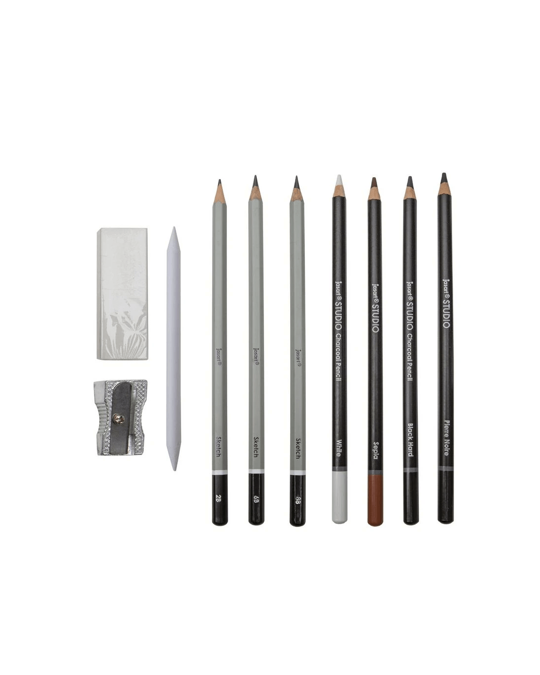 This Jasart Graphite Sketch Set offers a wide range of quality art pencils for all types of applications. Inside you'll find 2B, 6B and 8B Graphite Sketching Pencils, as well as a, Sepia Pencil, Charcoal Pencil, White Charcoal Pencil, Pierre Noire Pencil. This pack also comes with the following accessories; Paper Stump, Metal Sharpener and White Vinyl Eraser.
