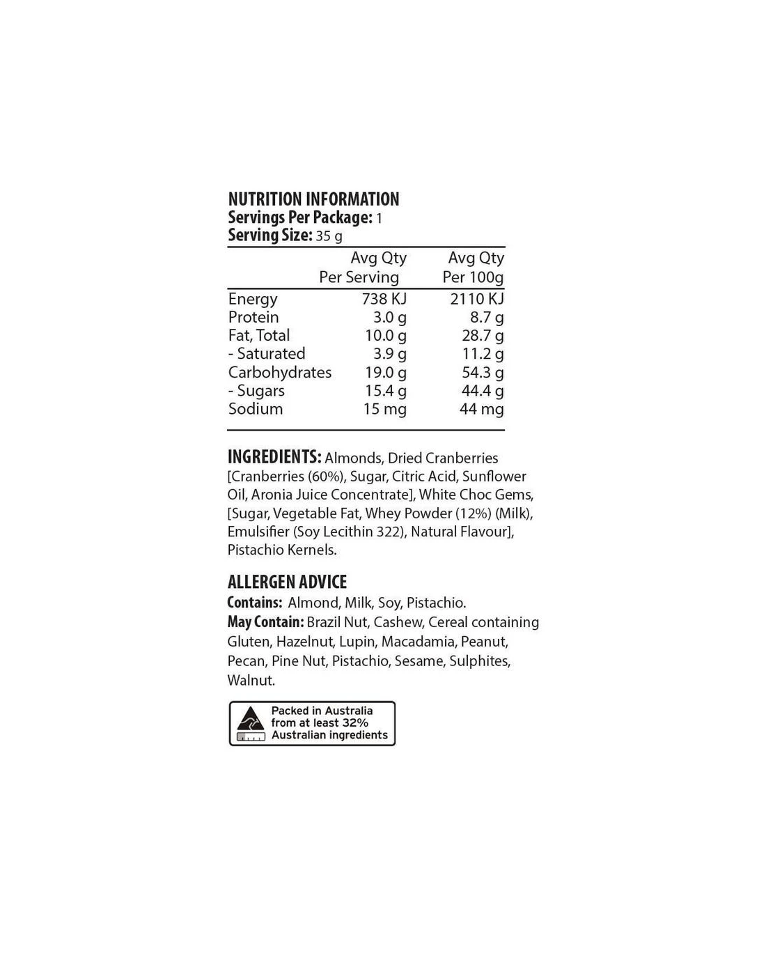 • This mix contains tree nuts, and may contain peanuts, other tree nuts, milk, gluten, soy, sulphites, and sesame seeds.