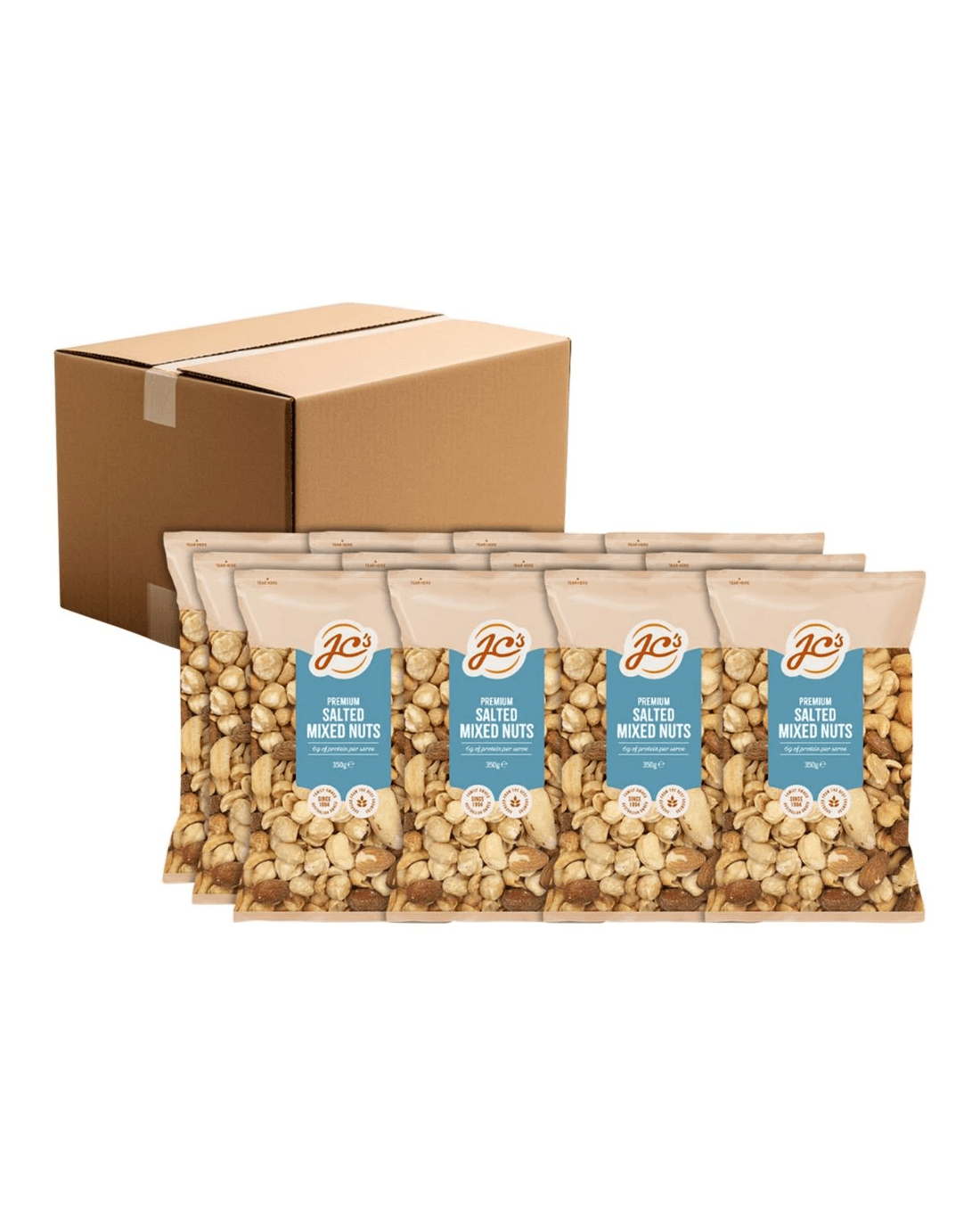 This pack of JC's Mixed Salted Nuts can be enjoyed as a tasty snack, a delicious side to your meal, or chopped up and added into a salad. This pack contains 12 x 350 g bags of mixed nuts including cashews, peanuts, almonds, brazil nuts, and hazelnuts.