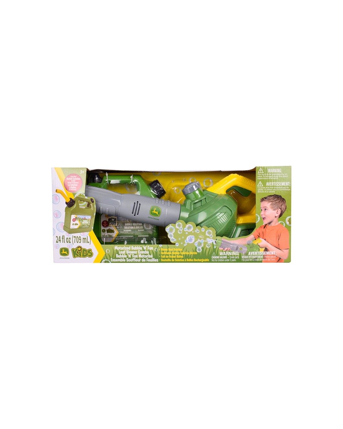 The John Deere Bubble Leaf Blower and Bubble Refill Gas Can is designed for outdoor fun and imaginative play. Perfect for young children, this motorised toy helps kids help with yard work while creating a continuous stream of bubbles, making outdoor activities more enjoyable.