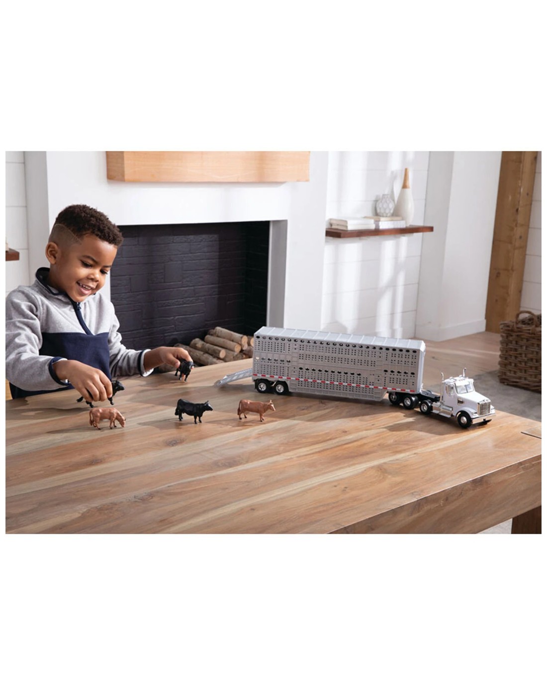 This item is a part of the Big Roads line of playable kids toys by TOMY ERTL. This set features a Freightliner 122SD day cab, a livestock trailer and eight head of cattle. The grain trailer has an opening tarp and opening rear grain doors with fold down ramp for easy unloading! This set is constructed of durable plastic and is perfect for both indoor and outdoor play. Ages: 3 +
