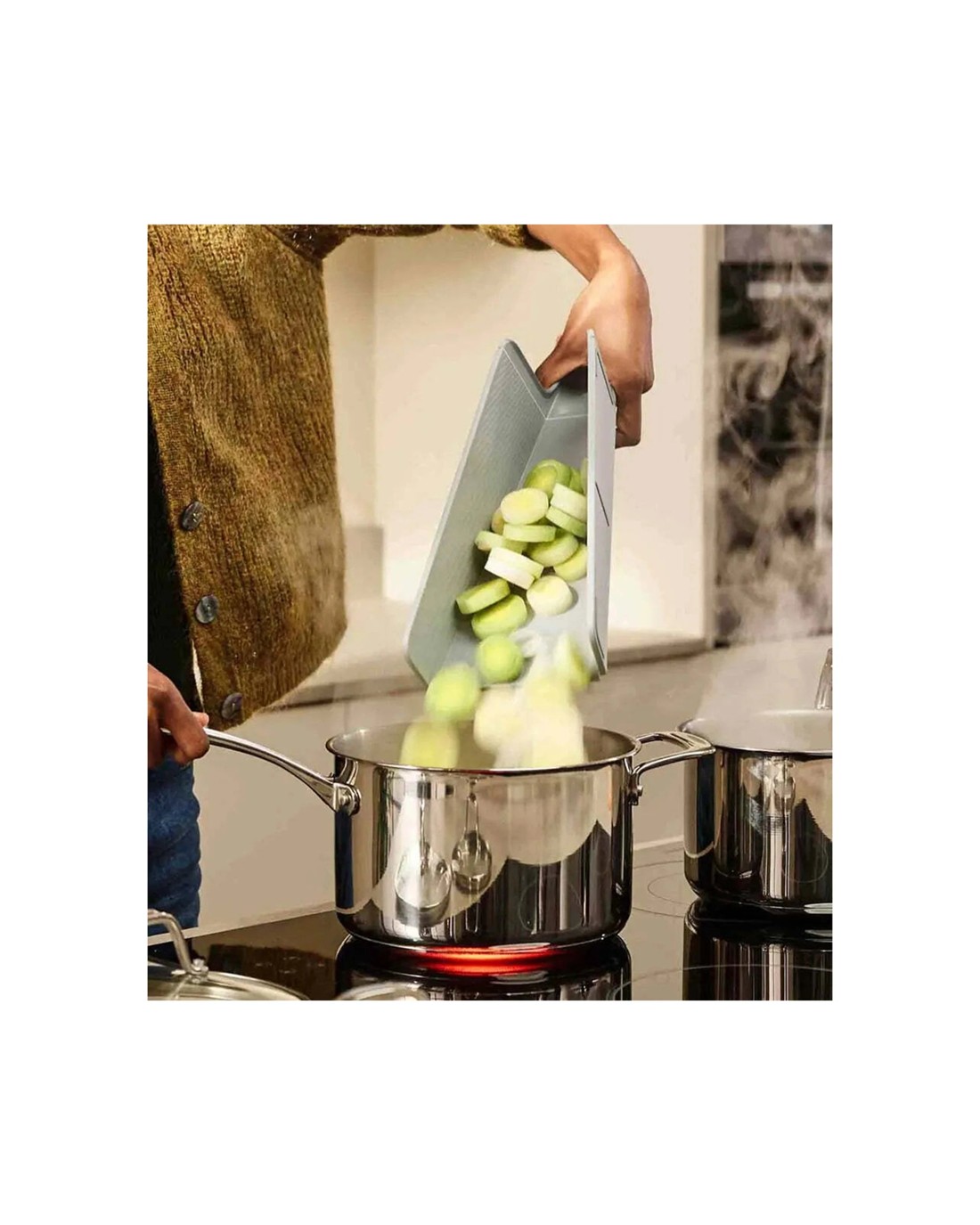 This chopping board features a textured, knife-friendly polypropylene surface that provides a safe and non-slip area for precise cutting. The soft-grip handle and non-slip feet enhance stability and comfort during use, ensuring safe and comfortable chopping experiences. When not in use, the sides of the board fold up to form a convenient chute, guiding chopped food or waste neatly into your cookware or bin. The addition of a compression foot on the base helps keep the board flatter while chopping, improving safety and ease of use.