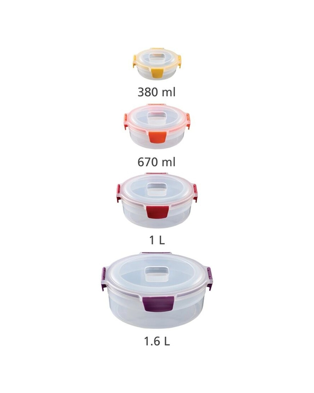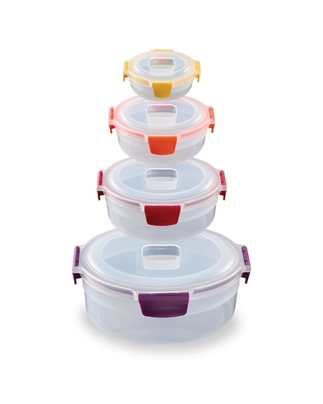 The Joseph Joseph Nest Lock Round Food Container Set is designed for efficient and secure food storage. This versatile set helps keep your food fresh while saving space in your kitchen cupboards.Thanks to their unique nesting design, the containers fit neatly inside each other, maximising storage efficiency. The colour-coded lids and bases make it easy to identify and match containers quickly, while the lockable, airtight, and leakproof lids ensure your food stays fresh and prevents spills during storage or transport.Key Features:Secure Food Preservation: Lockable, airtight, and leakproof lids keep food fresh and prevent leaks during storage and transport.Space-Saving Design: Containers nest neatly inside each other for efficient and clutter-free cupboard storage.Easy Identification: Colour-coded lids and bases simplify matching and improve organisation.Versatile Sizes: Includes four containers in capacities of 380 ml, 670 ml, 1 litre, and 1.6 litres, suitable for various storage needs.Durable Materials: Made from polypropylene, these containers are suitable for fridge, freezer, and on-the-go use.Specifications:Brand: Joseph JosephProduct Type: Food Storage SetNumber of Pieces: 4Capacities: 380 ml, 670 ml, 1 litre, 1.6 litresDesign: Round, nesting bases with colour-coded lids