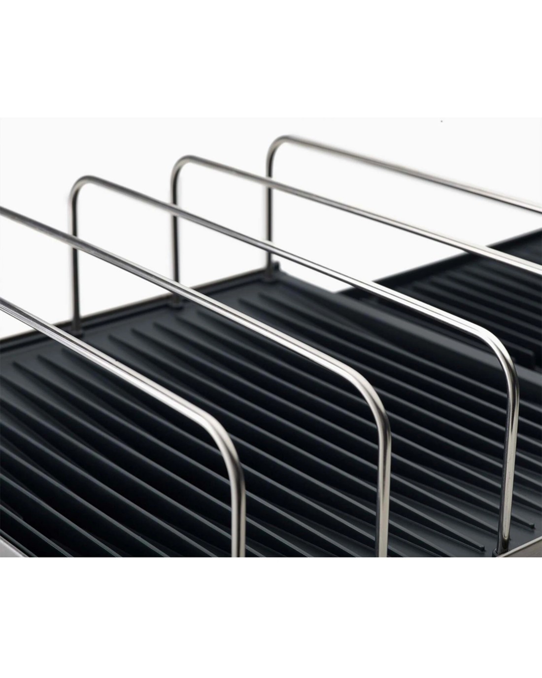 Constructed from fingerprint-proof stainless steel, it offers durability and easy maintenance. Raised ribs ensure water drains effectively, preventing pooling under glasses and bowls for cleaner drying. The rack includes rails to lean cookware and chopping boards against, and a movable cutlery drainer with knife slots enhances safety and organisation.